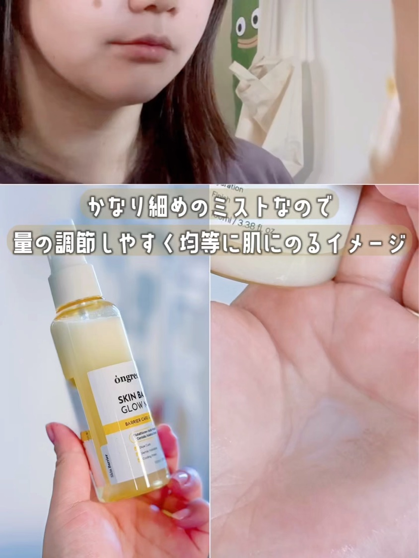 - 「ongredients(オングリディエンツ)」が、ついに日本のオフライン店舗に登場! <2025年8月30日(土)(*1)より全国のプラザ、ドン・キホーテ(*2)にて先行販売を開始> 水光トナーと水分グロウ(ツヤ)成分が融合し、まるでハイライトを施したようなツヤ肌ミストを実現 【主要成分】 ・ツボクサ葉エキス(*3) 乾燥などの外的刺激を受けた肌を整え、肌バリア(*4)機能を守ります。 ・複合ペプチド(*5) 肌のコンディションを整え、ハリのある肌印象へと導きます。 ・ヒアルロン酸(*6)&パンテノール(*7) 乾燥した肌を保湿ししっとり健やかに保ちます。 【こんな方におすすめ】 ・外的刺激により乾燥で肌がゆらぐのが気になる方 ・保湿とキメのダブルケアをしたい方 ・メイクの上からでも!外出先でも、肌にうるおいを与えたい方 (*1)店頭開始日となり、購入可能日は各店舗により異なります。 (*2)一部店舗を除きます。 (*3)整肌成分 (*4)角質層のうるおいを保つこと (*5)トリペプチド-1銅,トリペプチド-1,パルミトイルトリペプチド-1,パルミトイルペンタペプチド-4,ヘキサペプチド-11,ヘキサペプチド-9 (*6)ヒアルロン酸Na,ヒアルロン酸クロスポリマーNa,ヒアルロン酸K,ヒアルロン酸ヒドロキシプロピルトリモニウム,加水分解ヒアルロン酸Na,加水分解ヒアルロン酸,ヒアルロン酸(保湿成分) (*7)保湿成分