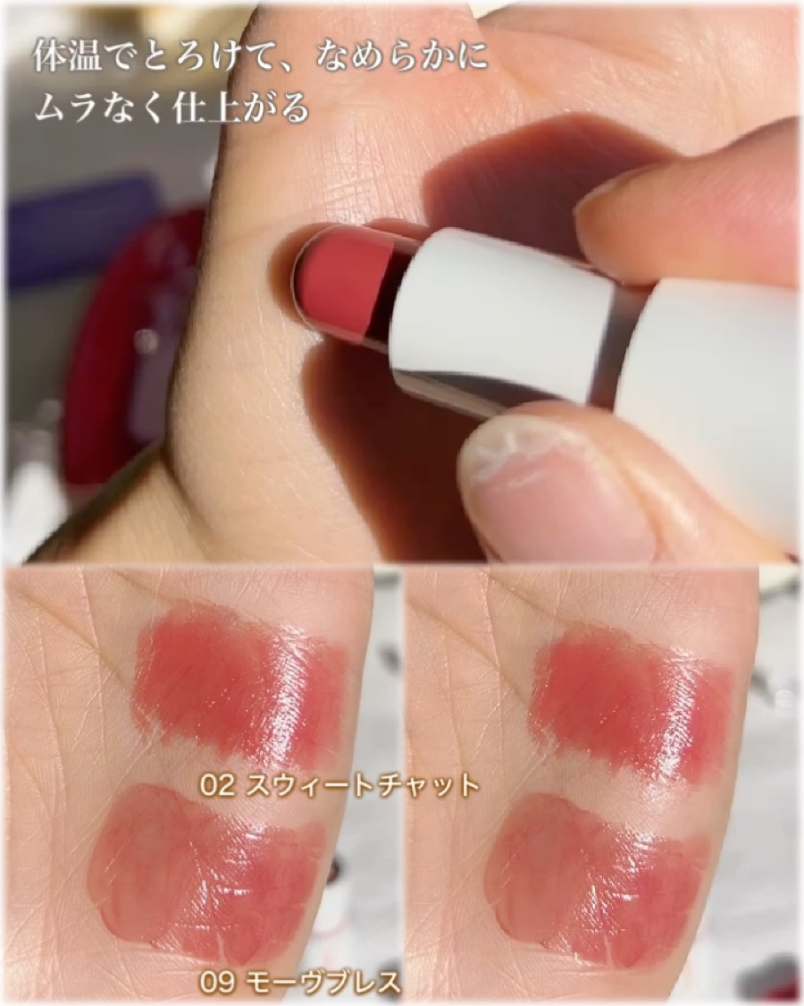 - 塗るたびに、ときめきが走り出す。メイクの楽しさを加速する「#止まらぬリップ」。 肌なじみのいい発色と自然なツヤで今っぽい唇に仕上がる、10色展開。 うるおいをチャージして、ほんのり血色感*¹をじゅわりと与えます。 どんな時でも使いやすい軽やかな塗り心地で、なりたい私を叶える仕上がりに! 【POINT】 ■ヘルシーに魅せる#MLBHリップ 「MLBH =MY LIPS BUT HEALTHIER」。自然なツヤとカラーで、いつもの唇がもっと健康的な印象に見える仕上がりに! ■〝今っぽさ〞を叶える自然なツヤめき ツヤと血色感*¹がほどよく両立。ラズベリーシードオイル*²配合で、うるおいを守りながらツヤめく唇に。 ■軽く均一にフィット。チークにも◎ ひと塗りでムラを防いでフィットし、自然な血色感*¹をプラス。チークにも使えます。 *1 メイクアップ効果による *2 (ラズベリー種子油/コハク酸トコフェロール)アミノプロパンジオールエステルズ(整肌成分)
