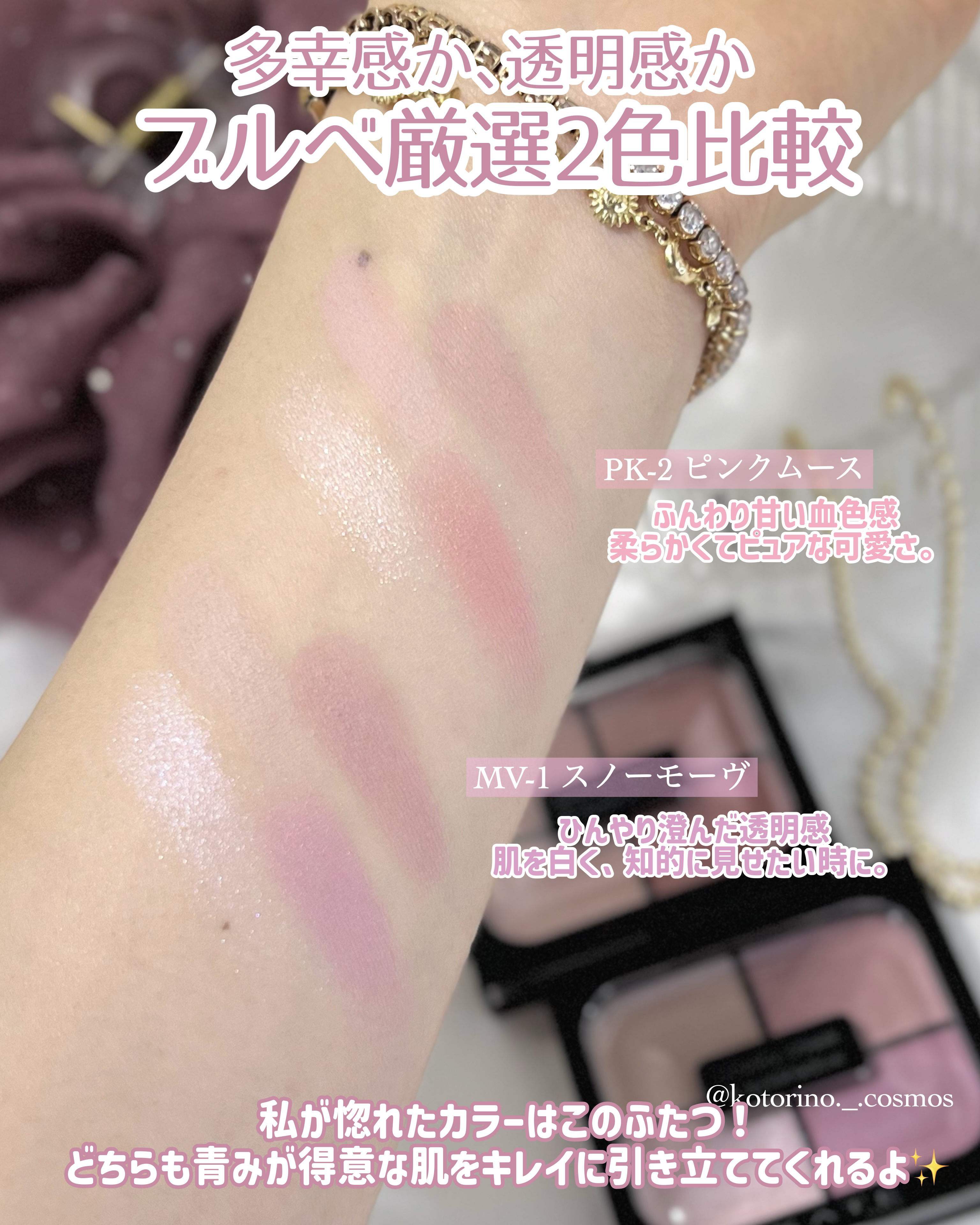 - <BE-1 メルティーベージュ> マイカ、合成フルオロフロゴパイト、ジメチコン、シリカ、ジエチルヘキサン酸ネオペンチルグリコール、ジフェニルシロキシフェニルトリメチコン、イソノナン酸イソトリデシル、ダイマージリノール酸(フィトステリル/イソステアリル/セチル/ステアリル/ベヘニル)、リンゴ酸ジイソステアリル、コーンスターチ、窒化ホウ素、ステアリン酸亜鉛、(ジメチコン/ビニルジメチコン)クロスポリマー、ミリスチン酸Mg、トコフェロール、ミリスチン酸亜鉛、イソステアリン酸ソルビタン、水添ポリイソブテン、エチルパラベン、メチルパラベン、デヒドロ酢酸Na、(+/-)アルミナ、グンジョウ、コンジョウ、パルミチン酸、ラウロイルアスパラギン酸Na、塩化亜鉛、酸化チタン、酸化亜鉛、酸化鉄、水酸化Al、硫酸Ba、トリイソステアリン酸イソプロピルチタン、酸化スズ、ホウケイ酸(Ca/Al)、黄4、赤202、赤226 <MV-1 スノーモーヴ> マイカ、合成フルオロフロゴパイト、ジメチコン、シリカ、ジエチルヘキサン酸ネオペンチルグリコール、ジフェニルシロキシフェニルトリメチコン、イソノナン酸イソトリデシル、ダイマージリノール酸(フィトステリル/イソステアリル/セチル/ステアリル/ベヘニル)、リンゴ酸ジイソステアリル、コーンスターチ、窒化ホウ素、ステアリン酸亜鉛、(ジメチコン/ビニルジメチコン)クロスポリマー、ミリスチン酸Mg、トコフェロール、ミリスチン酸亜鉛、イソステアリン酸ソルビタン、水添ポリイソブテン、エチルパラベン、メチルパラベン、デヒドロ酢酸Na、(+/-)アルミナ、グンジョウ、コンジョウ、パルミチン酸、ラウロイルアスパラギン酸Na、塩化亜鉛、酸化チタン、酸化亜鉛、酸化鉄、水酸化Al、硫酸Ba、トリイソステアリン酸イソプロピルチタン、酸化スズ、ホウケイ酸(Ca/Al)、黄4、赤202、赤226 <OR-1 パウダリーアプリコット> マイカ、合成フルオロフロゴパイト、ジメチコン、シリカ、ジエチルヘキサン酸ネオペンチルグリコール、ジフェニルシロキシフェニルトリメチコン、イソノナン酸イソトリデシル、ダイマージリノール酸(フィトステリル/イソステアリル/セチル/ステアリル/ベヘニル)、リンゴ酸ジイソステアリル、コーンスターチ、窒化ホウ素、ステアリン酸亜鉛、(ジメチコン/ビニルジメチコン)クロスポリマー、ミリスチン酸Mg、トコフェロール、ミリスチン酸亜鉛、イソステアリン酸ソルビタン、水添ポリイソブテン、エチルパラベン、メチルパラベン、デヒドロ酢酸Na、(+/-)アルミナ、グンジョウ、コンジョウ、パルミチン酸、ラウロイルアスパラギン酸Na、塩化亜鉛、酸化チタン、酸化亜鉛、酸化鉄、水酸化Al、硫酸Ba、トリイソステアリン酸イソプロピルチタン、酸化スズ、ホウケイ酸(Ca/Al)、黄4、赤202、赤226 <PK-1 ウォームピーチ> マイカ、合成フルオロフロゴパイト、ジメチコン、シリカ、ジエチルヘキサン酸ネオペンチルグリコール、ジフェニルシロキシフェニルトリメチコン、イソノナン酸イソトリデシル、ダイマージリノール酸(フィトステリル/イソステアリル/セチル/ステアリル/ベヘニル)、リンゴ酸ジイソステアリル、コーンスターチ、窒化ホウ素、ステアリン酸亜鉛、(ジメチコン/ビニルジメチコン)クロスポリマー、ミリスチン酸Mg、トコフェロール、ミリスチン酸亜鉛、イソステアリン酸ソルビタン、水添ポリイソブテン、エチルパラベン、メチルパラベン、デヒドロ酢酸Na、(+/-)アルミナ、グンジョウ、コンジョウ、パルミチン酸、ラウロイルアスパラギン酸Na、塩化亜鉛、酸化チタン、酸化亜鉛、酸化鉄、水酸化Al、硫酸Ba、トリイソステアリン酸イソプロピルチタン、酸化スズ、ホウケイ酸(Ca/Al)、黄4、赤202、赤226 <PK-2 ピンクムース> マイカ、合成フルオロフロゴパイト、ジメチコン、シリカ、ジエチルヘキサン酸ネオペンチルグリコール、ジフェニルシロキシフェニルトリメチコン、イソノナン酸イソトリデシル、ダイマージリノール酸(フィトステリル/イソステアリル/セチル/ステアリル/ベヘニル)、リンゴ酸ジイソステアリル、コーンスターチ、窒化ホウ素、ステアリン酸亜鉛、(ジメチコン/ビニルジメチコン)クロスポリマー、ミリスチン酸Mg、トコフェロール、ミリスチン酸亜鉛、イソステアリン酸ソルビタン、水添ポリイソブテン、エチルパラベン、メチルパラベン、デヒドロ酢酸Na、(+/-)アルミナ、グンジョウ、コンジョウ、パルミチン酸、ラウロイルアスパラギン酸Na、塩化亜鉛、酸化チタン、酸化亜鉛、酸化鉄、水酸化Al、硫酸Ba、トリイソステアリン酸イソプロピルチタン、酸化スズ、ホウケイ酸(Ca/Al)、黄4、赤202、赤226