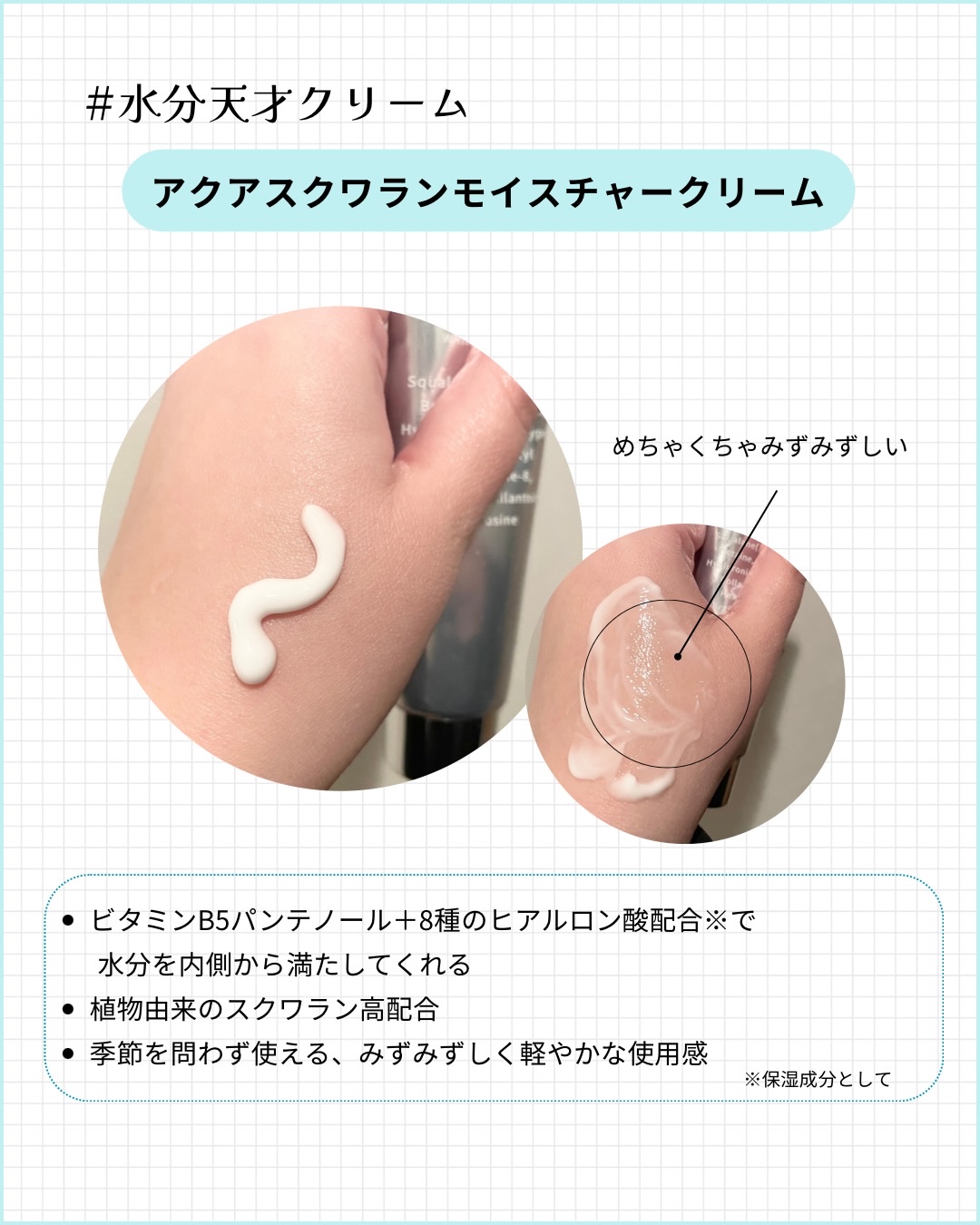 - もちもち水分チャージ! さっぱりとしたテクスチャーで明るく輝くうるツヤ水光肌。 べたつきNO!界面活性剤NO! 一年中使えるしっとり水分クリーム