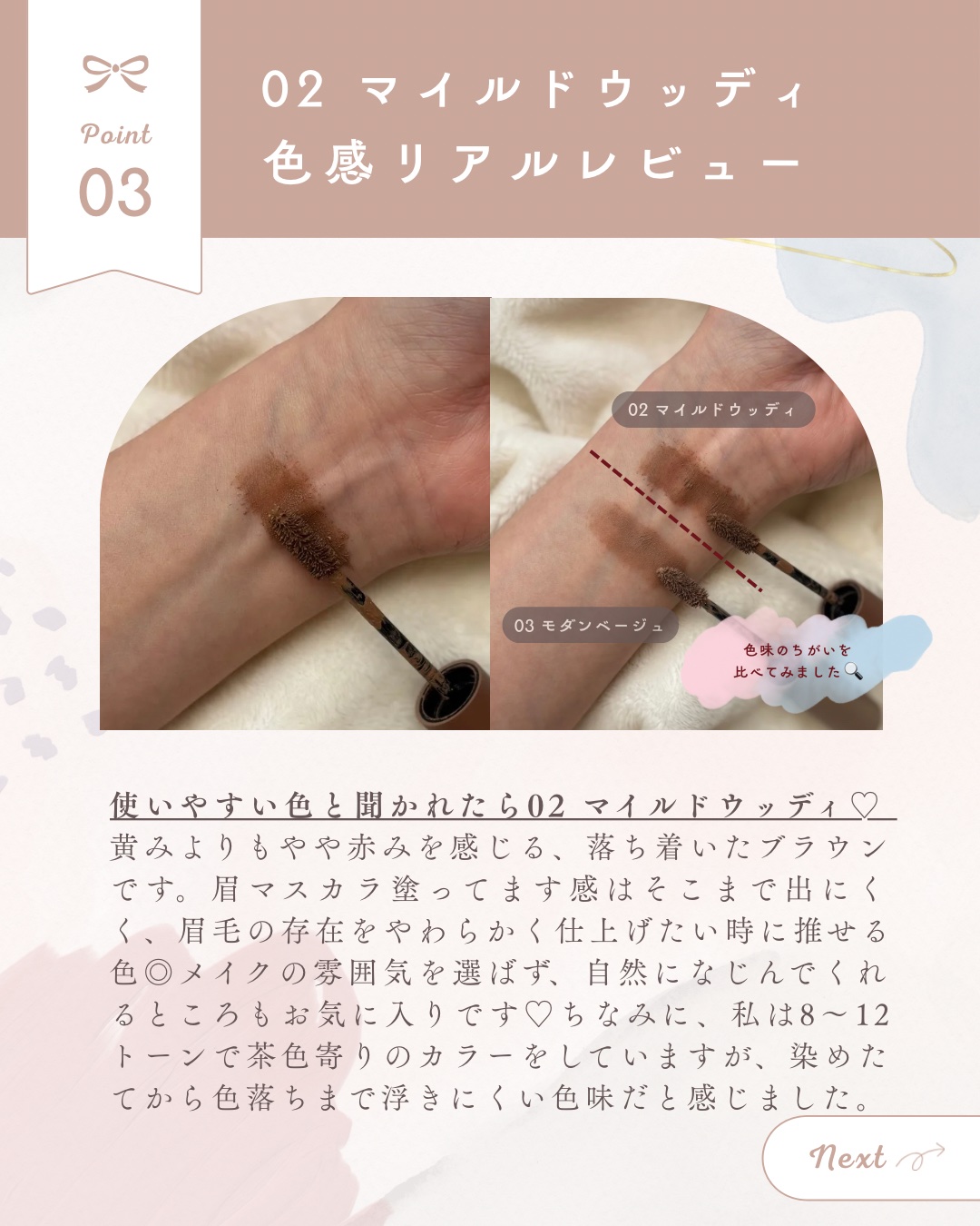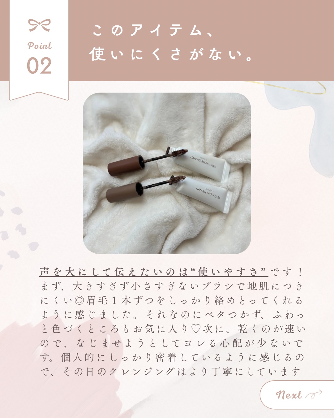 - さっとひと塗りで印象変わるブロウタッチ 1.なりたい眉カラーへ自然にムードチェンジ 2.眉本来の質感を生かし、流れを整え自然な立体感を演出 3.ムラなく仕上がり 1 本 1 本しっかり密着