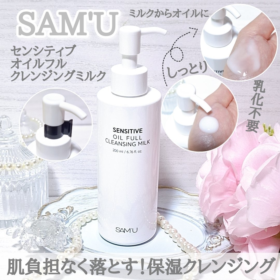 #PR◆SAM'U/センシティブオイルフルクレンジングミルクなめらかなミルクにオイルが28%加えてあるので、洗浄力は高いのに肌への刺激は最低限に作られているクレンジングミルク🧴ミルク状からオイル状になるまでやさしくローリングするだけで、メイク...