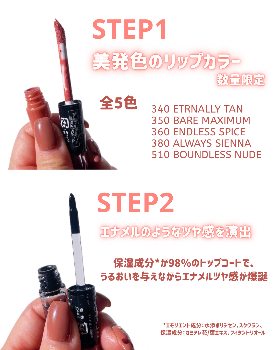 - <限定> 色持ちとツヤ感を両立 16時間*¹落ちにくい、2in1リップ ■リップカラーで美発色、トップコートでツヤ感を与えながら、カラーをキープ ■ エナメルのようなツヤ感を演出 ■ 98%が保湿成分*²のトップコートでうるおいキープ *¹ レブロン研究所調べ(個人差が出る場合があります) *² エモリエント成分:水添ポリデセン、スクワラン、 保湿成分:カミツレ花/葉エキス、フィタントリオール