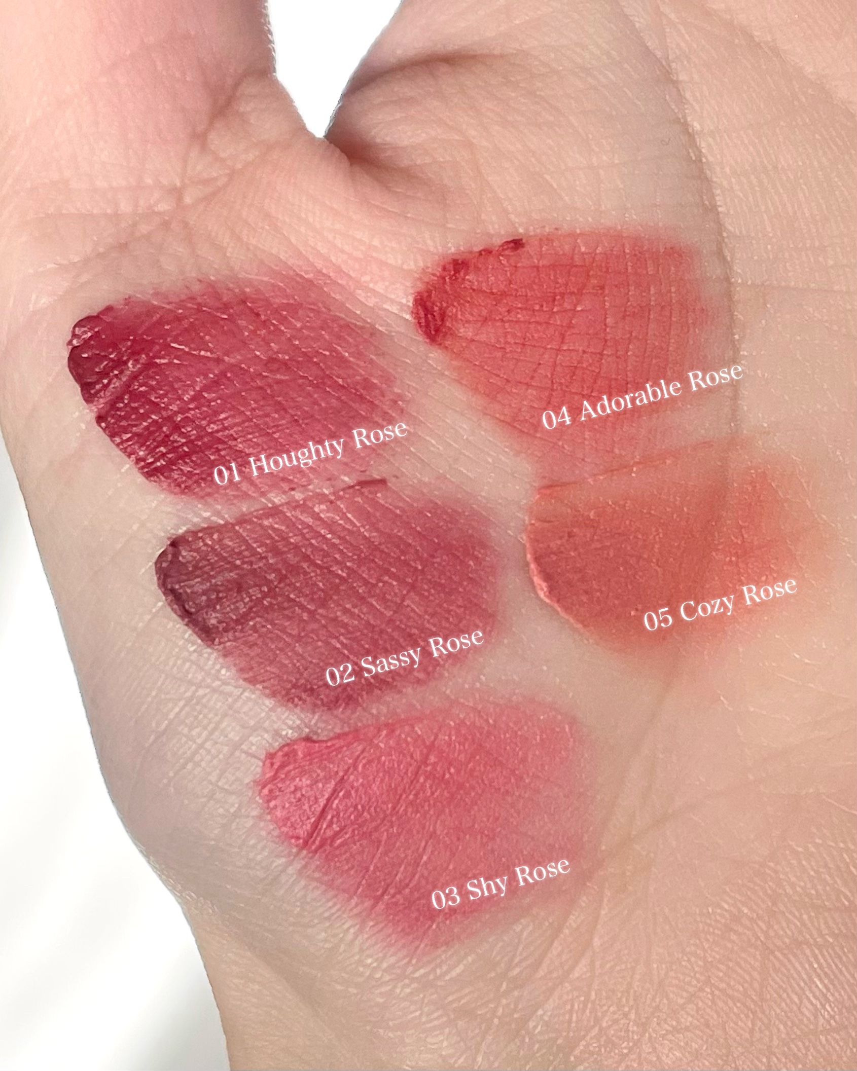 適度に白みが入ってるので、素の唇の色ムラを綺麗に補正してくれる ポメロスキンは唇にのせると淡いピンクベージュのように発色し、特にヌカダミアはブルベのためのヌードレッドブラウンって感じでブルベの私でもめちゃくちゃハマりました🥺✨✨ ピーリングエンドゥは4色の中で1番彩度が高く、フィグフィグから少し青みを抜いた感じの色味です。 そして大人気のベアーグレープはブルベさんなら無条件に買うべき最高に可愛いヌード青みピンク♡