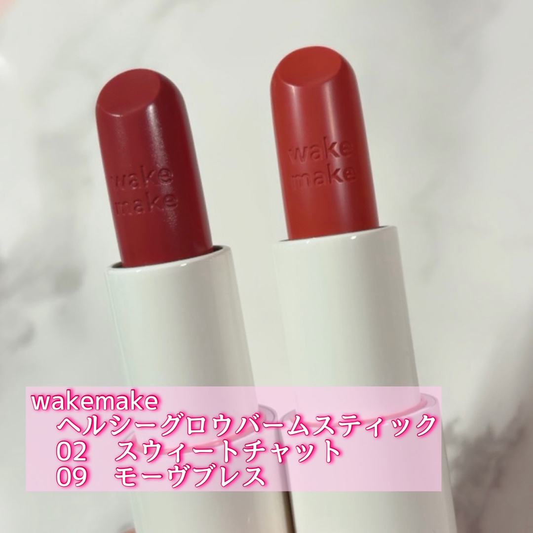 wakemakeHEALTHYGLOWBALMSTICK02スウィートチャット09モーヴブレスwakemakeは4月末からリブランディングしてロゴが小文字に!パケも可愛い🤍Amazon・全国バラショ(一部店舗除く)で販売中!唇がキレイに見える...