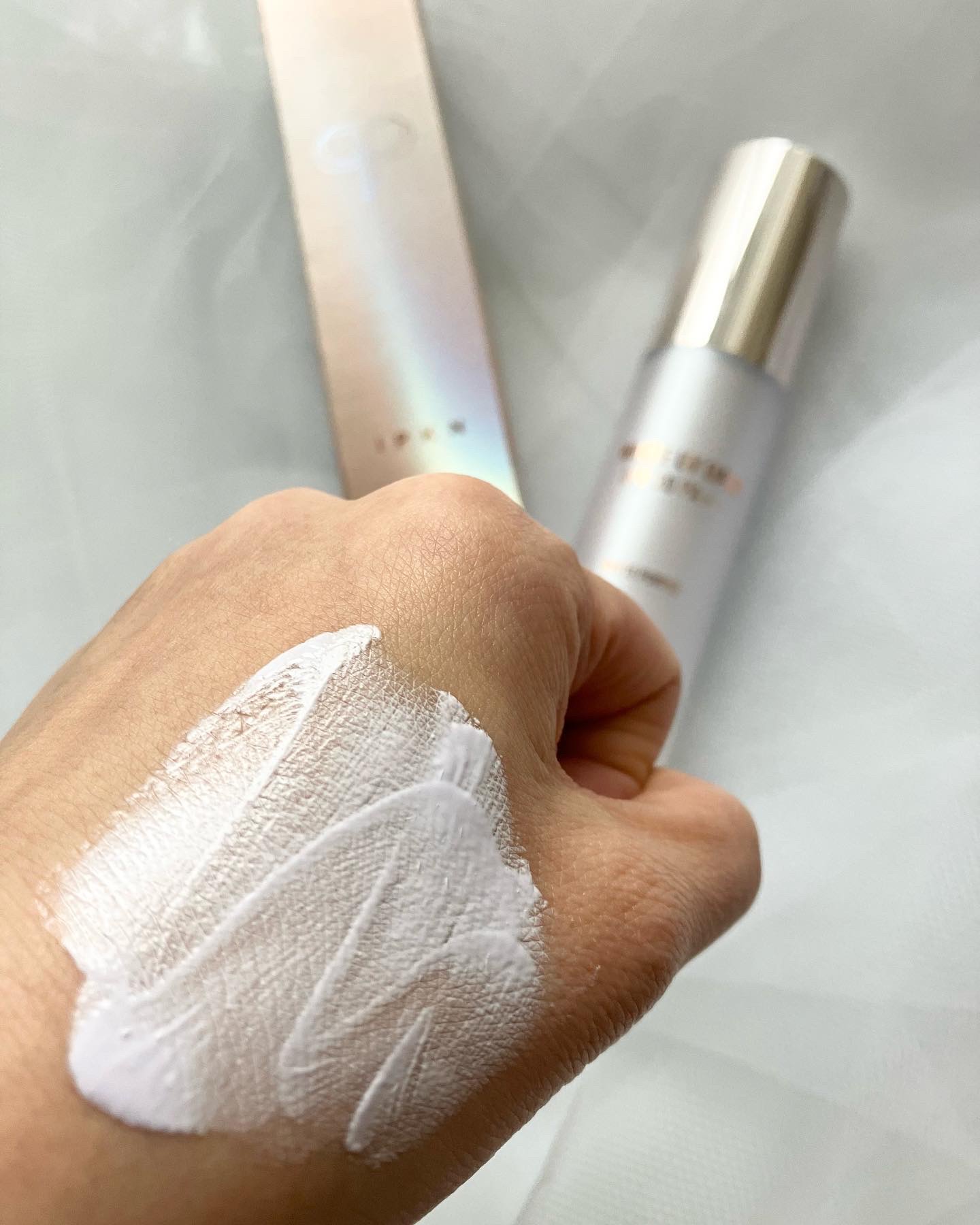 - #1.WHITE GREEN "水、シクロペンタシロキサン、グリセリン、メトキシケイヒ酸エチルヘキシル 、酸化チタン、タルク、PEG-10ジメチコン、DPG、アルブチン、ラウリン酸ヘキシル、酸化亜鉛、ジステアルジモニウムヘクトライト、硫酸Mg、ポリリシノレイン酸ポリグリセリル-6、フェノキシエタノール、(アクリレーツ/ジメチコン)コポリマー、パルミチン酸、(ジメチコン/ビニルジメチコン)クロスポリマー、酸化クロム、カプリリルグリコール、メチコン、カプリル酸グリセリル、酢酸トコフェロール、香料、エチルヘキシルグリセリン、水酸化Al、ステアリン酸Al、ジメチコン、グンジョウ、トリエトキシカプリリルシラン、BHT、グリチルレチン酸ステアリル、アスコルビルグルコシド、水添ポリデセン、シラカンバ樹液、BG、トコフェロール、1,2-ヘキサンジオール、アロエベラ液汁、カキ葉エキス、ハス花エキス、バラエキス、ソケイエキス、ラッパズイセン花エキス、ユリエキス、イリスベルシコロルエキス、フリージアエキス、EDTA-2Na、安息香酸Na、クエン酸、ソルビン酸K" #2.WHITE PURPLE 水、シクロペンタシロキサン、グリセリン、メトキシケイヒ酸エチルヘキシル、酸化チタン、タルク、PEG-10ジメチコン、DPG、アルブチン、ラウリン酸ヘキシル、酸化亜鉛、ジステアルジモニウムヘクトライト、グンジョウ、硫酸Mg、ポリリシノレイン酸ポリグリセリル-6、フェノキシエタノール、(アクリレーツ/ジメチコン)コポリマー、パルミチン酸、(ジメチコン/ビニルジメチコン)クロスポリマー、カプリリルグリコール、メチコン、カプリル酸グリセリル、酢酸トコフェロール、香料、エチルヘキシルグリセリン、水酸化Al、ステアリン酸Al、ジメチコン、BHT、グリチルレチン酸ステアリル、アスコルビルグルコシド、水添ポリデセン、シラカンバ樹液、BG、トコフェロール、1,2-ヘキサンジオール、アロエベラ液汁、カキ葉エキス、ハス花エキス、バラエキス、ソケイエキス、ラッパズイセン花エキス、ユリエキス、イリスベルシコロルエキス、フリージアエキス、EDTA-2Na、安息香酸Na、クエン酸、ソルビン酸K