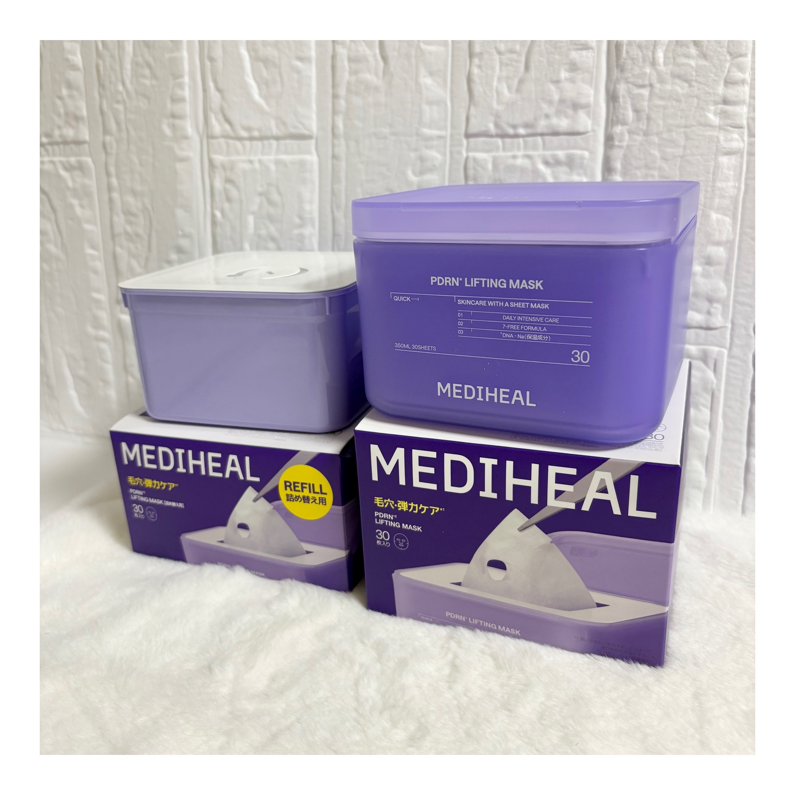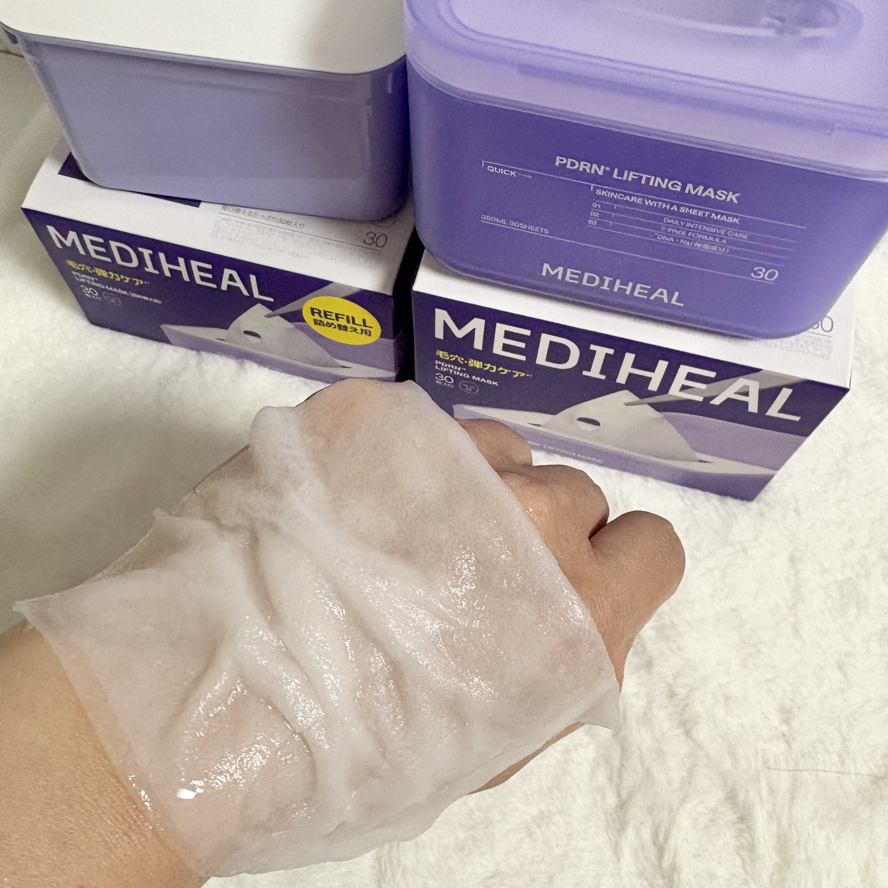 MEDIHEALPDRNリフティングマスク♡マスクパックの王道メディヒールの特別仕様「30枚大容量パック」✨話題の人気マスクで、リフィル対応のコスパの良さも嬉しい!エッセンスひたひたのシート。これ1枚で毛穴・ハリ・キメまでケア💖ピタッと密着し...