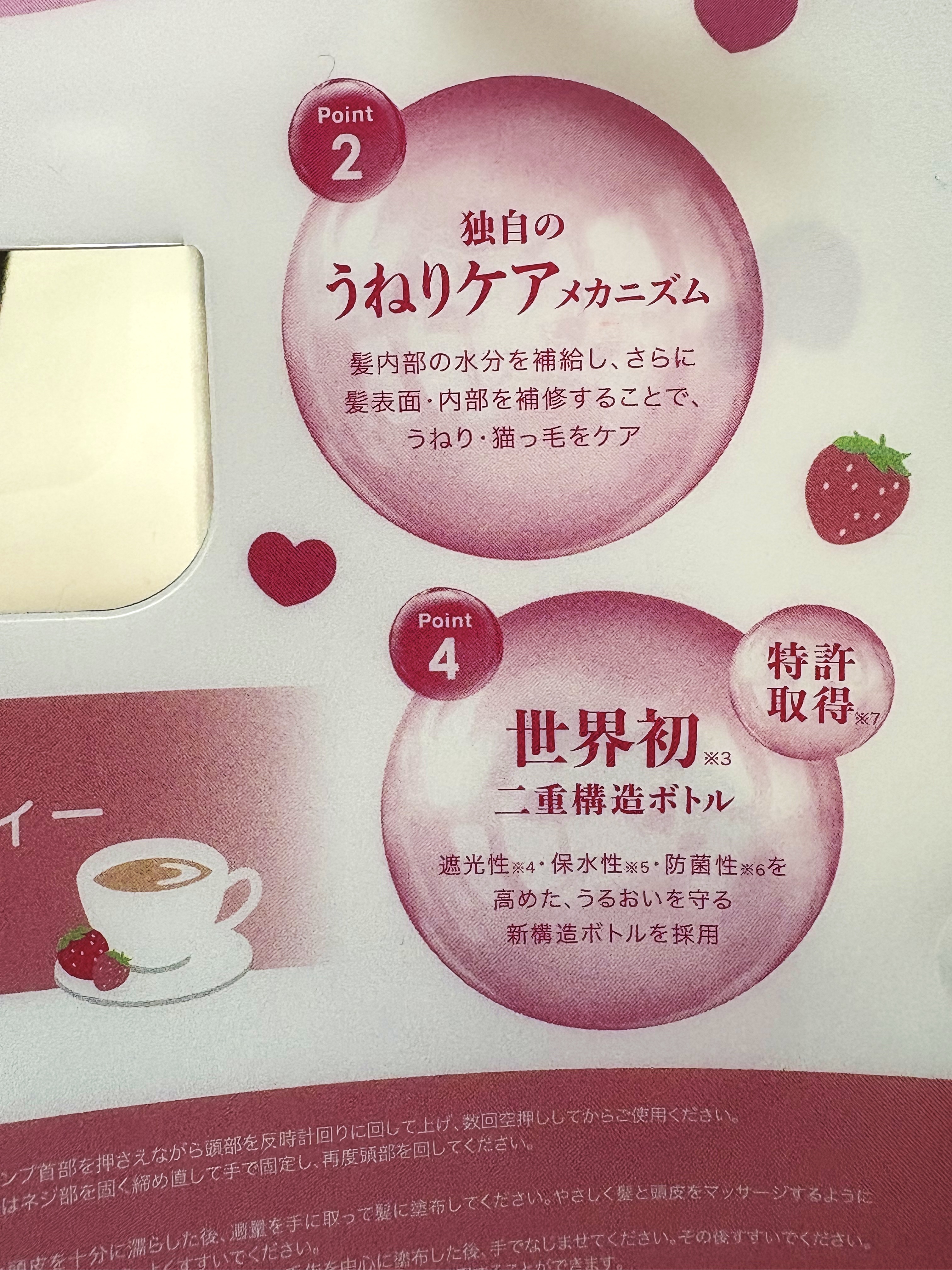 - 〈数量限定〉 1 . マイメロディ限定デザイン サンリオの人気キャラクター「マイメロディ」とコラボ!マイメロディといちごの世界観が可愛い限定デザインとなっております。 2 . うねりコントロール美容 うねりをケアする「うねりコントロール美容」で、髪内部の水分を補給し、外部からの水分吸収を抑え、髪表面・内部を補修する事でうねりをケア※2し、うるサラ髪へ導きます。 3 . 限定フレグランス マイメロディをイメージした甘くて可愛らしい “いちごミルクティー”の香りでバスタイムを華やかに彩ります。 ※2 うるおいを与えたことによる一時的な効果 ©️2025 SANRIO CO., LTD. APPROVAL NO. L655609