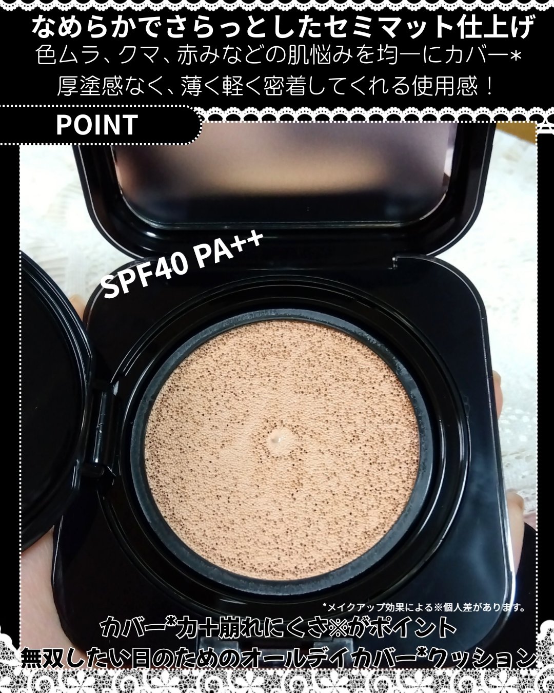 肌キメ、サテン、素肌感+カバー力を特徴としたクッションファンデ💓 セミマットな質感で自然なツヤ感を残しつつ、素肌のような仕上がり。 SPF50+PA+++で紫外線対策もばっちり🙆♀️