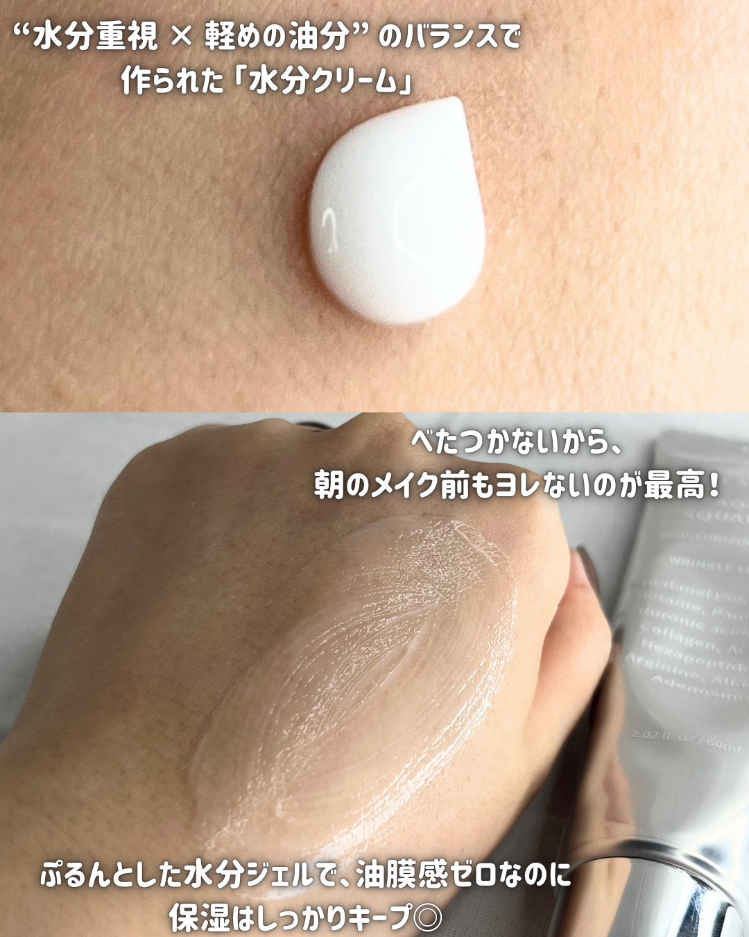 - もちもち水分チャージ! さっぱりとしたテクスチャーで明るく輝くうるツヤ水光肌。 べたつきNO!界面活性剤NO! 一年中使えるしっとり水分クリーム