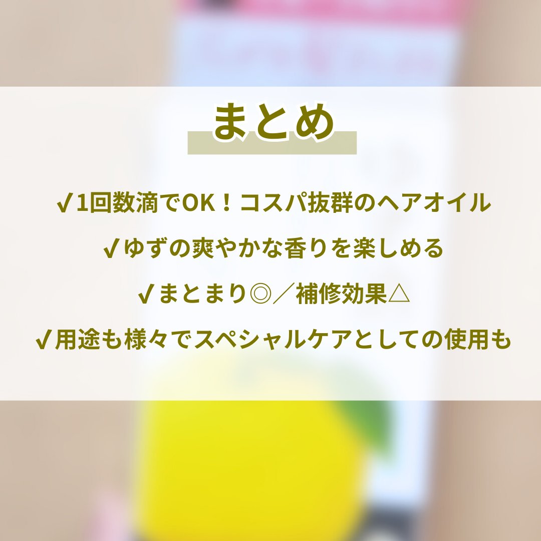- 2024年8月リニューアル 「ゆず油」シリーズの特長や、サステナブルな取り組みをより多くの方に知っていただくために、全品のパッケージデザインを一新しました。 くせ・うねりで広がる髪に。髪表面をコーティングし、湿気ブロック&毛髪ダメージ補修。 ベタつかずしっとりまとまるヘアオイル。爽やかなゆずの香り。 (シリコーン・合成香料・着色料・鉱物油・紫外線吸収剤・パラベンいずれも無添加)