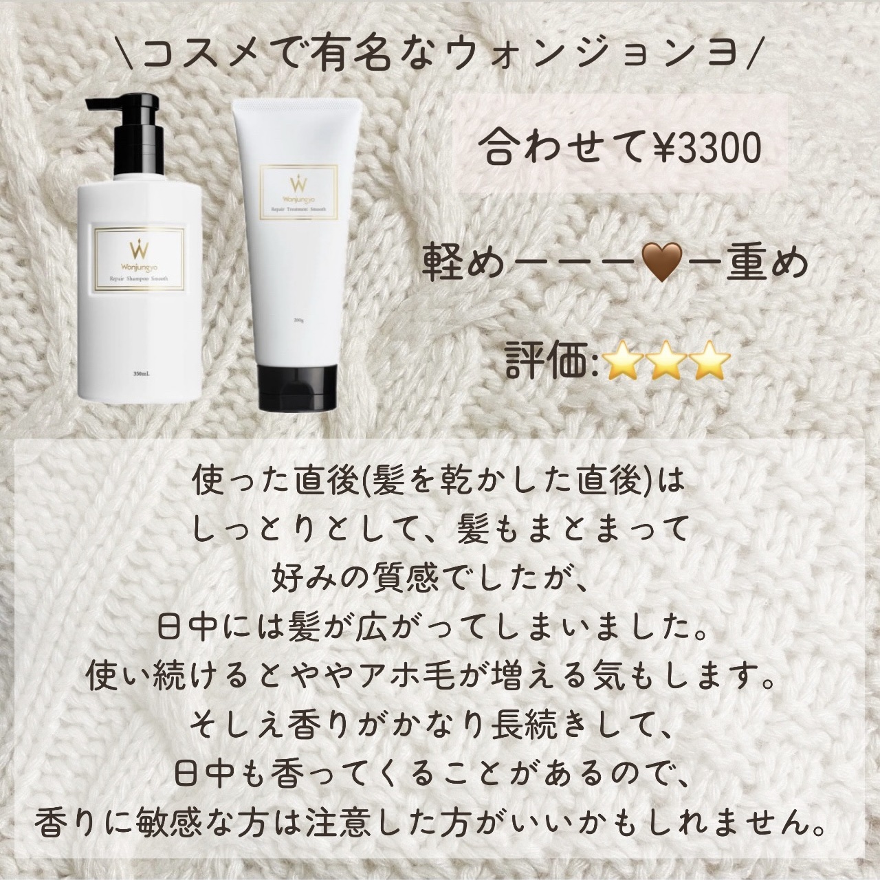 Wonjungyo ウォンジョンヨ リペアシャンプー スムース/リペアトリートメント スムース | 1,650円 |