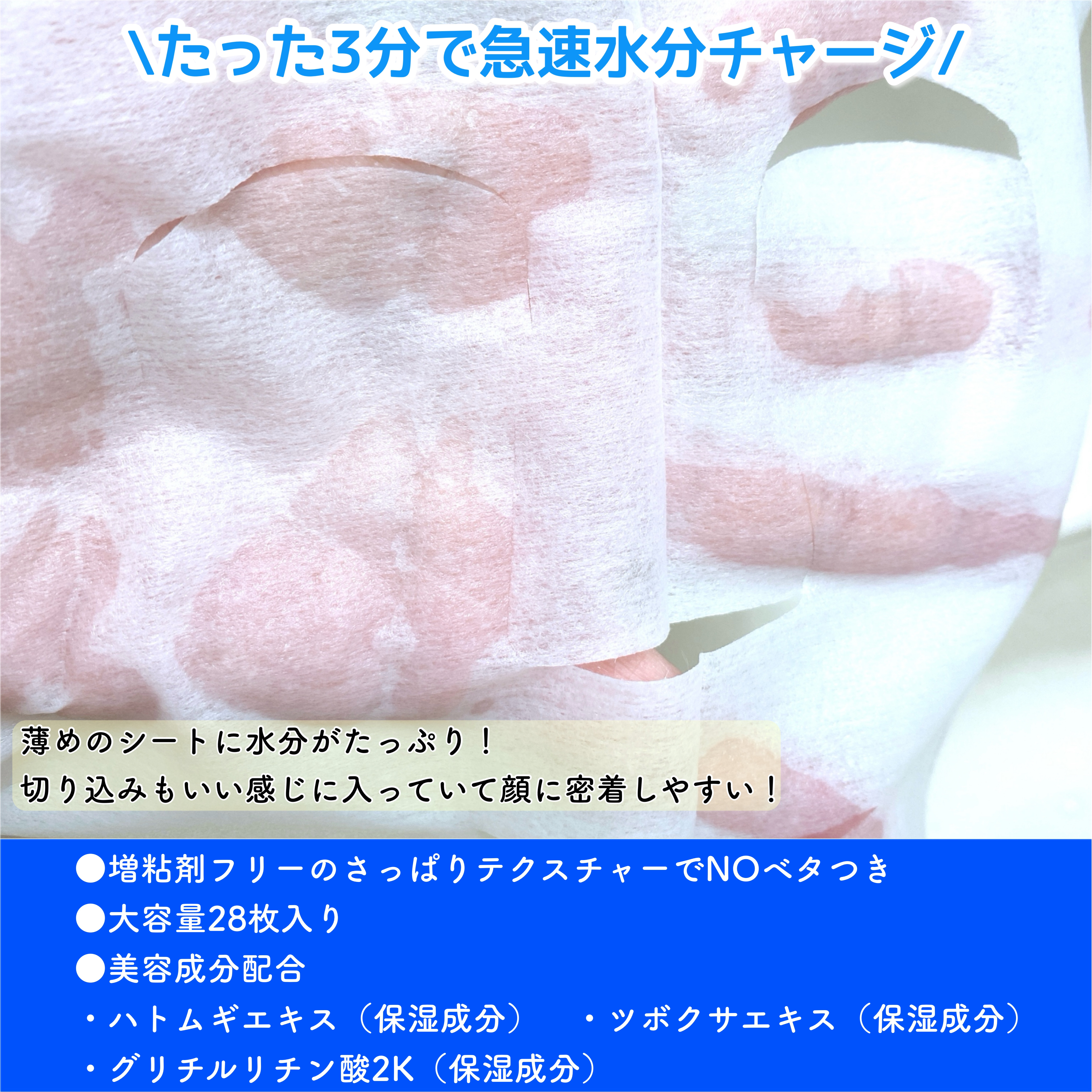 - 朝3分の急速水分チャージで化粧ノリ・もちUP! さっぱりみずみずしい使用感のシートマスク。朝の肌にたっぷり水分補給し、化粧ノリ・もちの良い肌に整えます。 べたつかないから即メイクもOK。すぐに次のステップに進めます。 28枚入りのたっぷり容量なので、毎日惜しみなくお使いいただけます。 ●無香料・無着色・アルコールフリー・オイルフリー・界面活性剤フリー・ノンコメドジェニックテスト済※ ※ すべての人にニキビのもと(コメド)ができないということではありません ●全国のマツモトキヨシ・ココカラファイングループおよびイミュ公式オンラインストアで発売