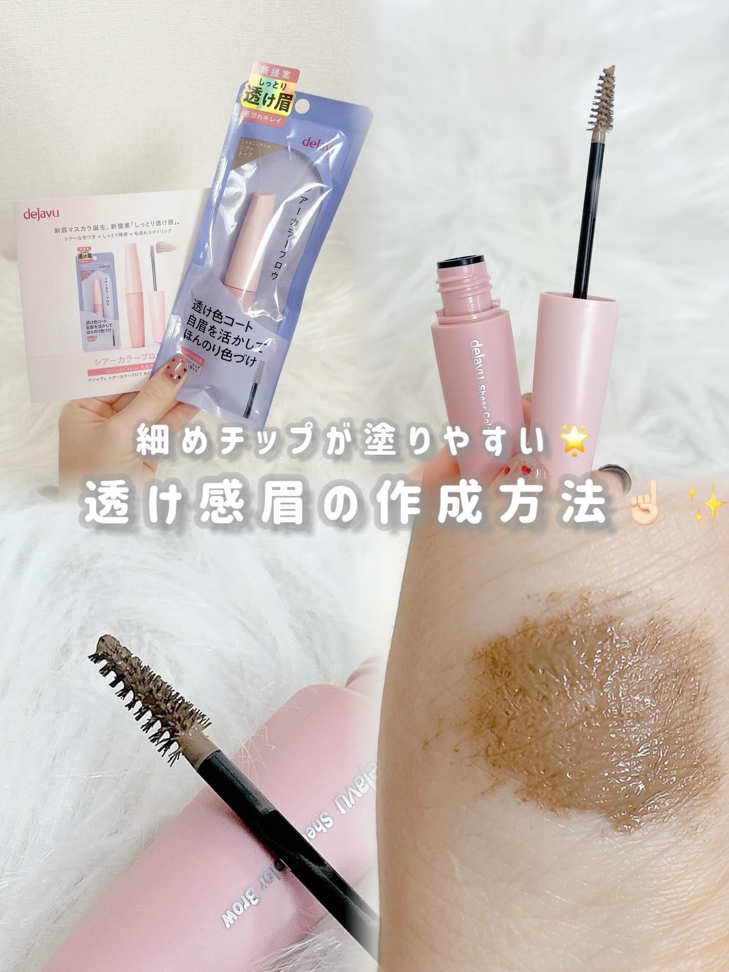 - \\デジャヴュからの新提案!自眉を活かしたシアーな色づきの眉マスカラ// 「シアーカラーブロウ」は、水彩絵の具のように“シアーな色づき”と、“美しい毛流れ”、 さらにパサつきのない“しっとりした質感”を1本で叶える眉マスカラ。 まるで元の眉がそのまま色づくような、“究極のナチュラル眉”に仕上げます*。 フィルムタイプで、皮脂・汗・こすれに強いのに、お湯だけで簡単に落とせます。 ※2025年12月以降、全国のバラエティストア、イミュ公式オンラインストアにて発売中! *ブランド内において デジャヴュ シアーカラーブロウ