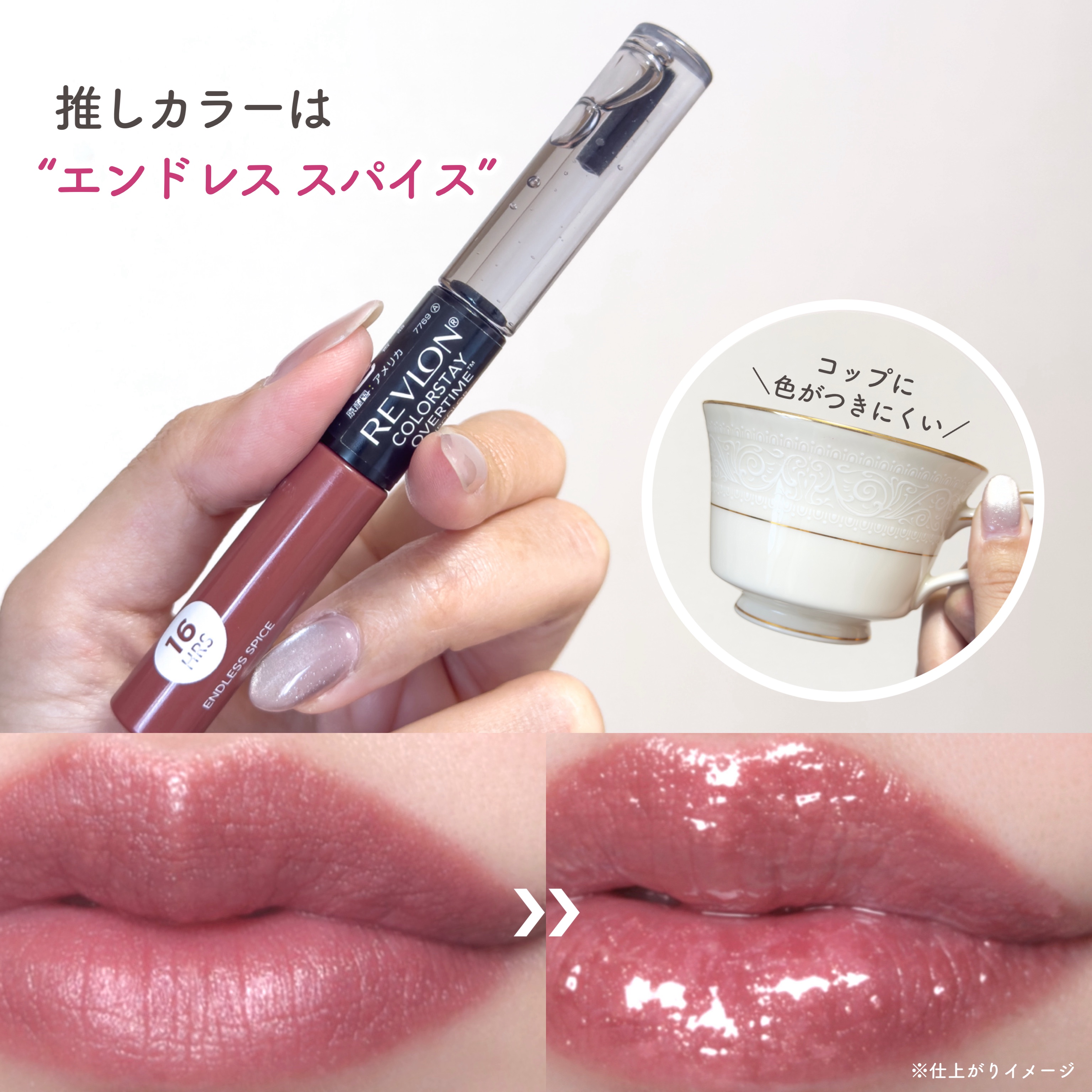 - <限定> 色持ちとツヤ感を両立 16時間*¹落ちにくい、2in1リップ ■リップカラーで美発色、トップコートでツヤ感を与えながら、カラーをキープ ■ エナメルのようなツヤ感を演出 ■ 98%が保湿成分*²のトップコートでうるおいキープ *¹ レブロン研究所調べ(個人差が出る場合があります) *² エモリエント成分:水添ポリデセン、スクワラン、 保湿成分:カミツレ花/葉エキス、フィタントリオール