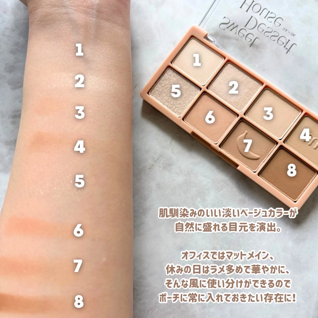 - 韓国で流行りのデザートをモチーフにした可愛い8色パレットが登場。 マット・マットパール・シマー・グリッター・ゼリー5種のテクスチャーのアイシャドウは、デイリーメイクはもちろん、様々なシーンのメイクに大活躍です。
