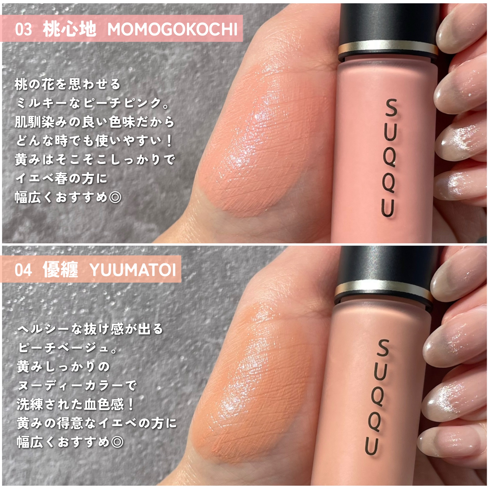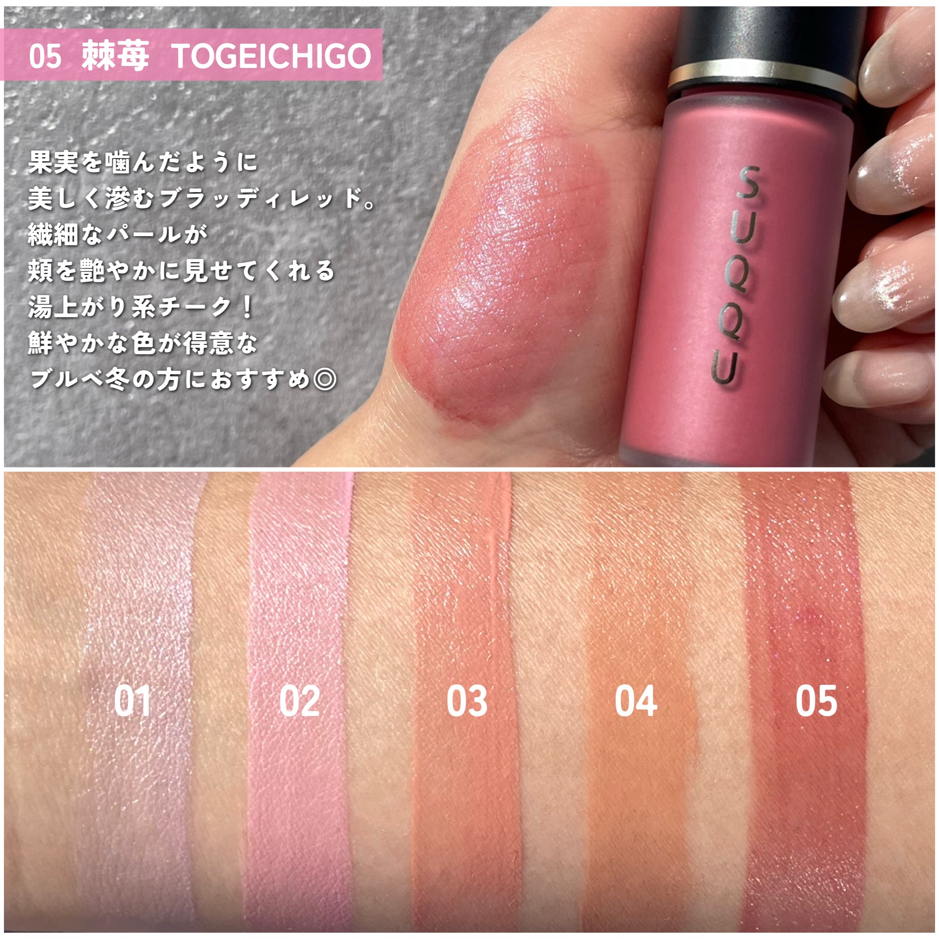 粉質がすごく良くなって、しっとり感とツヤ感が強くなりました! 04が個人的大ヒットで🥹💯 他のチークと混ぜて使うと、ツヤっぽくほわーっとした色付きになって最高! チーク要らない派の方に是非試してみて欲しいカラーです🫶🏻