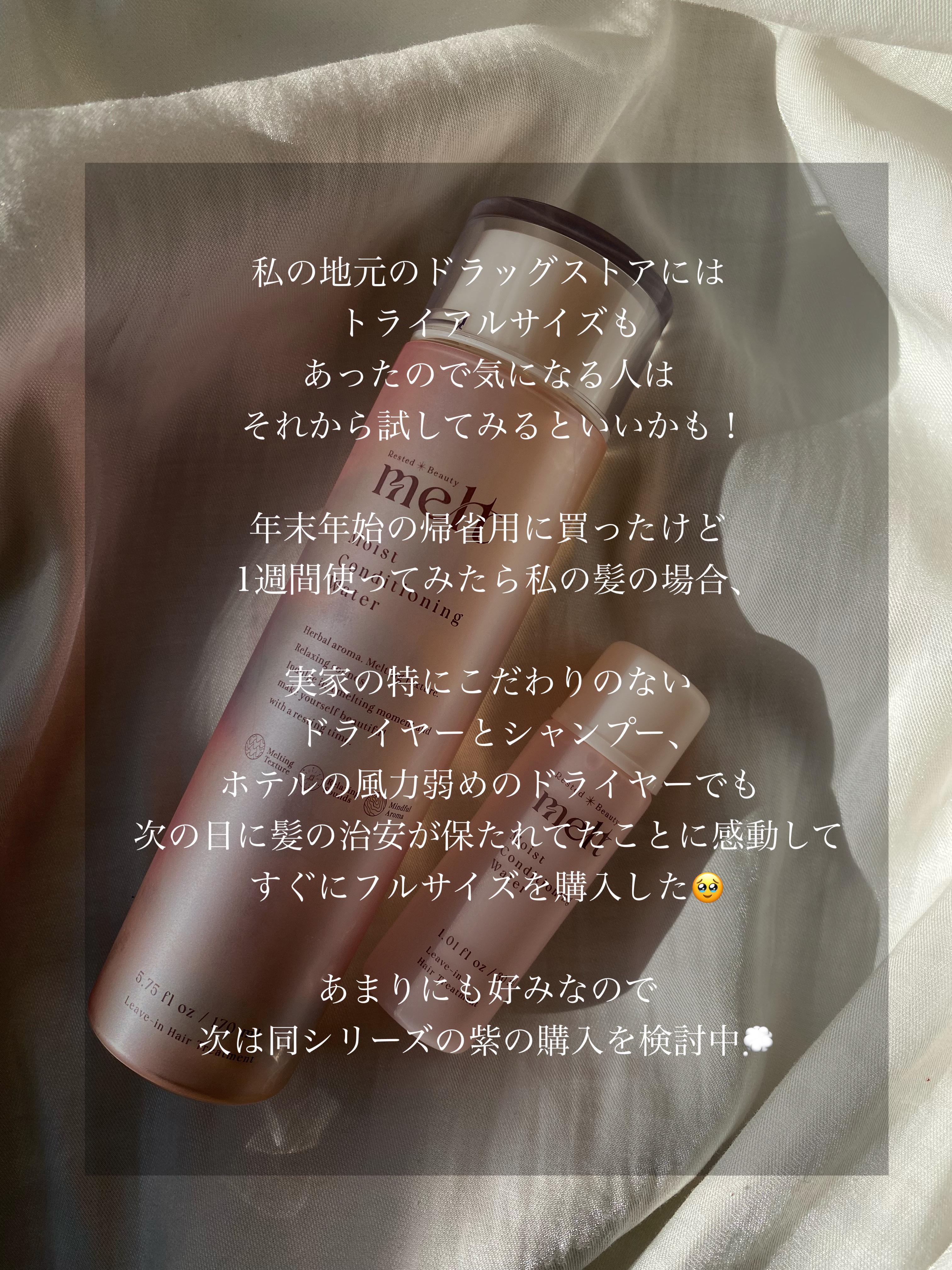 3/15発売🌸うねり髪*向けの髪の化粧水\♡/……………………………meltスムースコンディショニングウォーター……………………………時を忘れるようなマインドフルアロマピオニー&フィグの香り🩷✔️熱・摩擦によるダメージ補修&予防✔️ドライ...