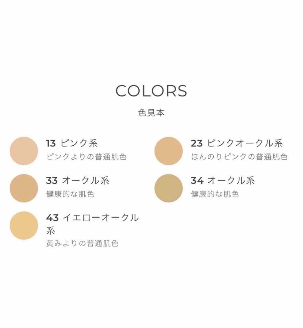 - <13 ピンク系> 着色成分 タルク適量、〃 酸化チタン適量、〃 酸化鉄適量、油性エモリエント成分 シクロペンタシロキサン15.45%、〃 ジメチコン15.00%、〃 トリエチルヘキサノイン1.80%、〃 ミツロウ0.70%、保湿成分 BG12.00%、〃 トレハロース0.03%、〃 ヒアルロン酸Na0.01%、感触改良成分 ナイロン-122.78%、サンスクリーン成分 メトキシケイヒ酸エチルヘキシル1.50%、表面処理剤 水酸化Al適量、〃 ステアリン酸適量、〃 メチコン適量、〃 ミネラルオイル適量、乳化剤 PEG-9ポリジメチルシロキシエチルジメチコン1.00%、防腐剤 メチルパラベン0.10%、製品の酸化防止剤 トコフェロール0.05%、成分の酸化防止剤 BHT適量、基剤 水全量を100%とする <23 ピンクオークル系> 着色成分 タルク適量、〃 酸化チタン適量、〃 酸化鉄適量、油性エモリエント成分 シクロペンタシロキサン15.45%、〃 ジメチコン15.00%、〃 トリエチルヘキサノイン1.80%、〃 ミツロウ0.70%、保湿成分 BG12.00%、〃 トレハロース0.03%、〃 ヒアルロン酸Na0.01%、感触改良成分 ナイロン-122.78%、サンスクリーン成分 メトキシケイヒ酸エチルヘキシル1.50%、表面処理剤 水酸化Al適量、〃 ステアリン酸適量、〃 メチコン適量、〃 ミネラルオイル適量、乳化剤 PEG-9ポリジメチルシロキシエチルジメチコン1.00%、防腐剤 メチルパラベン0.10%、製品の酸化防止剤 トコフェロール0.05%、成分の酸化防止剤 BHT適量、基剤 水全量を100%とする <33 オークル系> 着色成分 タルク適量、〃 酸化チタン適量、〃 酸化鉄適量、油性エモリエント成分 シクロペンタシロキサン15.45%、〃 ジメチコン15.00%、〃 トリエチルヘキサノイン1.80%、〃 ミツロウ0.70%、保湿成分 BG12.00%、〃 トレハロース0.03%、〃 ヒアルロン酸Na0.01%、感触改良成分 ナイロン-122.78%、サンスクリーン成分 メトキシケイヒ酸エチルヘキシル1.50%、表面処理剤 水酸化Al適量、〃 ステアリン酸適量、〃 メチコン適量、〃 ミネラルオイル適量、乳化剤 PEG-9ポリジメチルシロキシエチルジメチコン1.00%、防腐剤 メチルパラベン適量、製品の酸化防止剤 トコフェロール適量、成分の酸化防止剤 BHT適量、基剤 水全量を100%とする <34 オークル系> 着色成分 タルク適量、〃 酸化チタン適量、〃 酸化鉄適量、油性エモリエント成分 シクロペンタシロキサン15.45%、〃 ジメチコン15.00%、〃 トリエチルヘキサノイン1.80%、〃 ミツロウ0.70%、保湿成分 BG12.00%、〃 トレハロース0.03%、〃 ヒアルロン酸Na0.01%、感触改良成分 ナイロン-122.78%、サンスクリーン成分 メトキシケイヒ酸エチルヘキシル1.50%、表面処理剤 水酸化Al適量、〃 ステアリン酸適量、〃 メチコン適量、〃 ミネラルオイル適量、乳化剤 PEG-9ポリジメチルシロキシエチルジメチコン1.00%、防腐剤 メチルパラベン0.10%、製品の酸化防止剤 トコフェロール0.05%、成分の酸化防止剤 BHT適量、基剤 水全量を100%とする <32 オークル系> 着色成分 タルク適量、〃 酸化チタン適量、〃 酸化鉄適量、油性エモリエント成分 シクロペンタシロキサン15.45%、〃 ジメチコン15.00%、〃 トリエチルヘキサノイン1.80%、〃 ミツロウ0.70%、保湿成分 BG12.00%、〃 トレハロース0.03%、〃 ヒアルロン酸Na0.01%、感触改良成分 ナイロン-122.78%、サンスクリーン成分 メトキシケイヒ酸エチルヘキシル1.50%、表面処理剤 水酸化Al適量、〃 ステアリン酸適量、〃 メチコン適量、〃 ミネラルオイル適量、乳化剤 PEG-9ポリジメチルシロキシエチルジメチコン1.00%、防腐剤 メチルパラベン0.10%、製品の酸化防止剤 トコフェロール0.05%、成分の酸化防止剤 BHT適量、基剤 水全量を100%とする