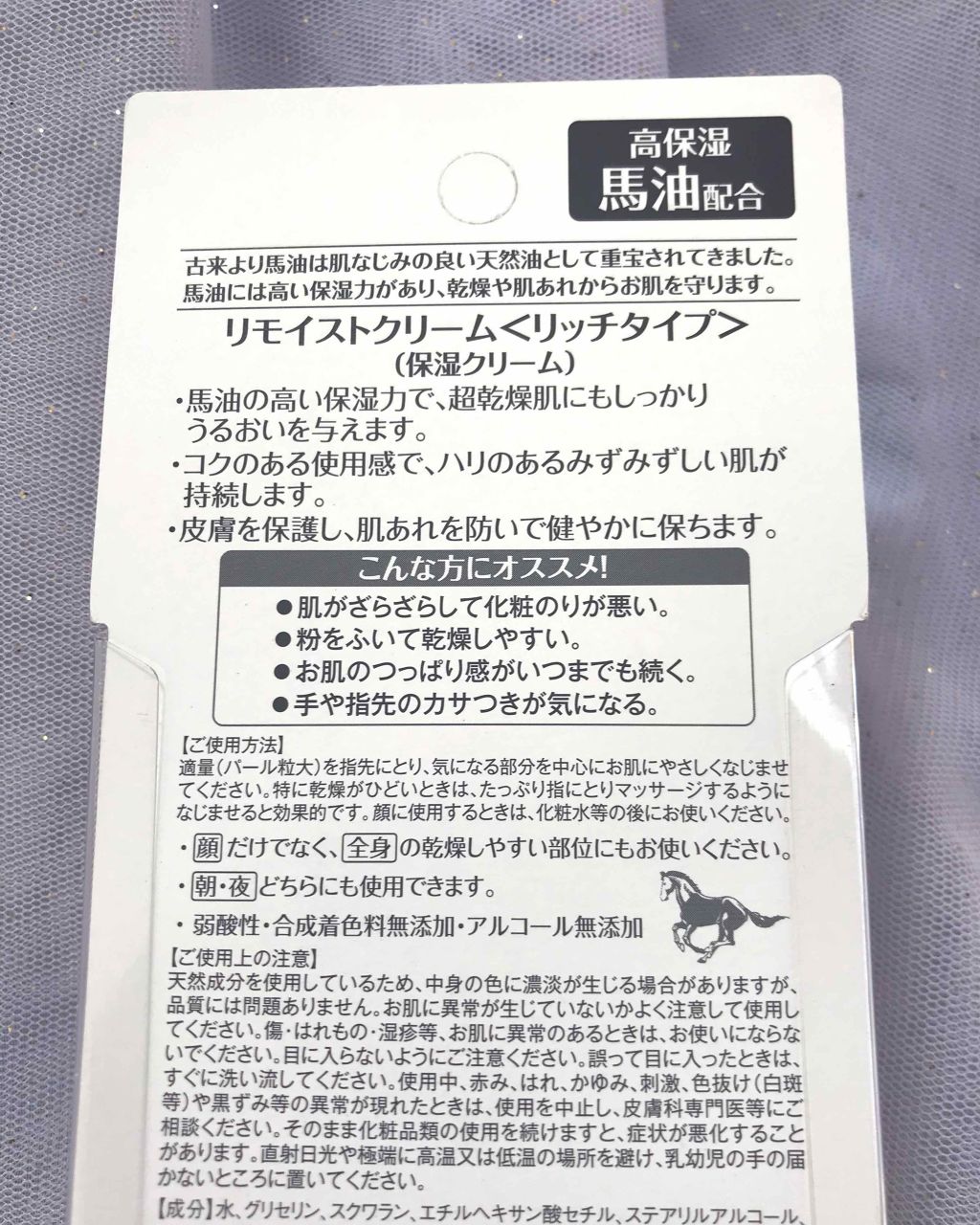 - 水・グリセリン・スクワラン・オクタン酸セチル・ステアリルアルコール・ステアリン酸グリセリル・BG・ワセリン・馬油・甘草エキス・コメ胚芽油・ミツロウ・ポリソルベート60・カルボマー・トリセテス―5リン酸・ジメチコン・水酸化Na・酢酸トコフェロール・BHT・メチルパラベン・プロピルパラベン・香料