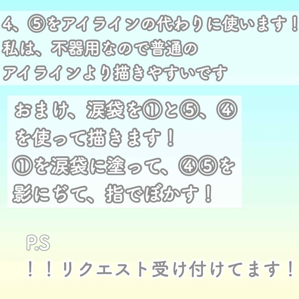 こんにちは、のん🐇です!今回は、涙袋の描き方とマッサージを紹介したいと思います!まずは描き方。何回も紹介していますが、また違うやり方で紹介します!🌸パーフェクトスタイリストアイズこれの、1の色を涙袋に塗ります。あまり下の方まで塗ると、元ある陰...