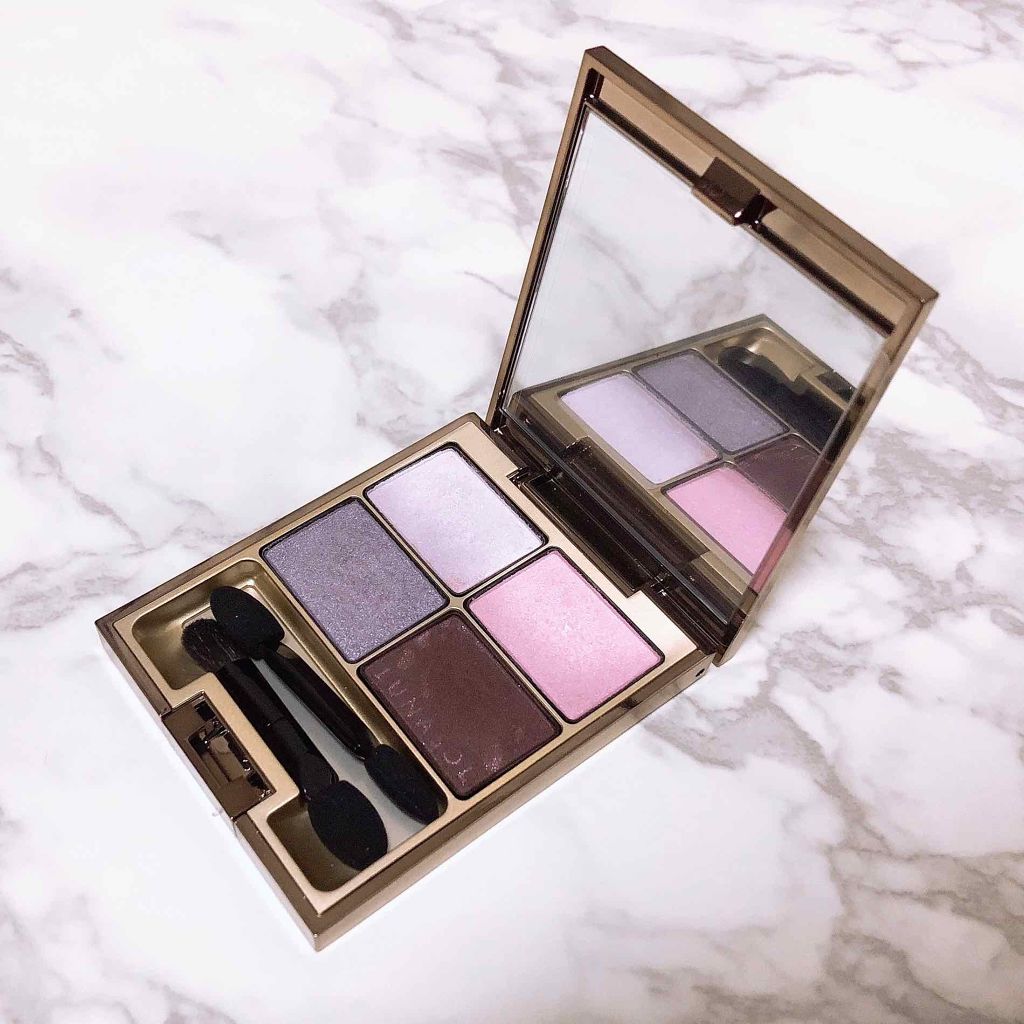 \ブルベ大勝利シャドウ/LUNASOLシャインフォールアイズ03Elegant目元の透明感を引き出してくれる、ブルベさんにぴったりの色味です☺️左上のカラーをアイホールと涙袋全体に塗って、右上のピンクを目頭側、左下のパープルを目尻側にのせると...