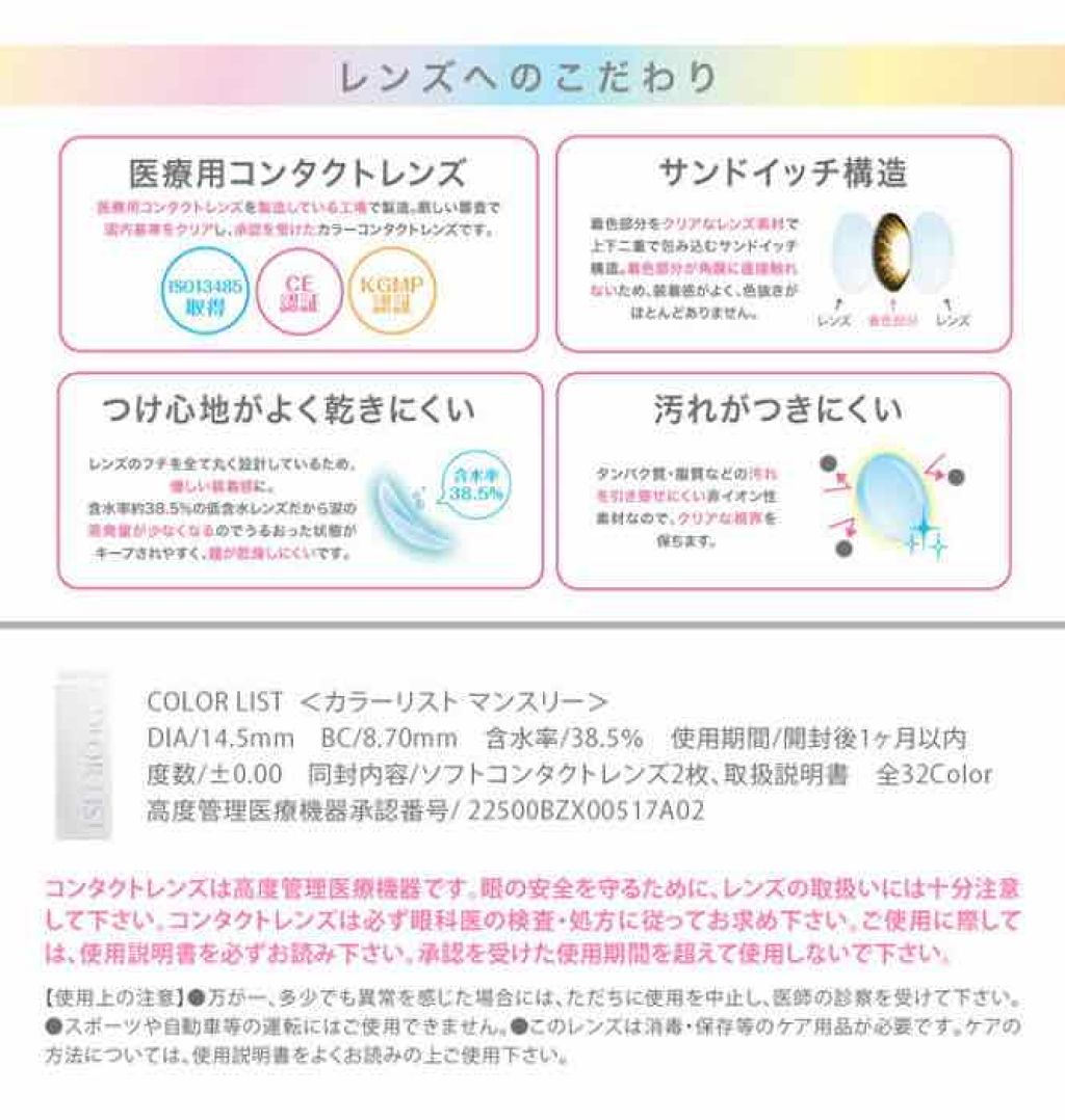 «COLORLIST»◽︎品名#BR09◽︎使用期限1month◽︎度数(PWR)度なし◽︎レンズ直径(DIA)14.5mm◽︎着色直径13.7mm◽︎レンズBC8.7mm◽︎含水率38.5%◽︎製造国韓国«カラコンレポ»サイズはちょうどいい...