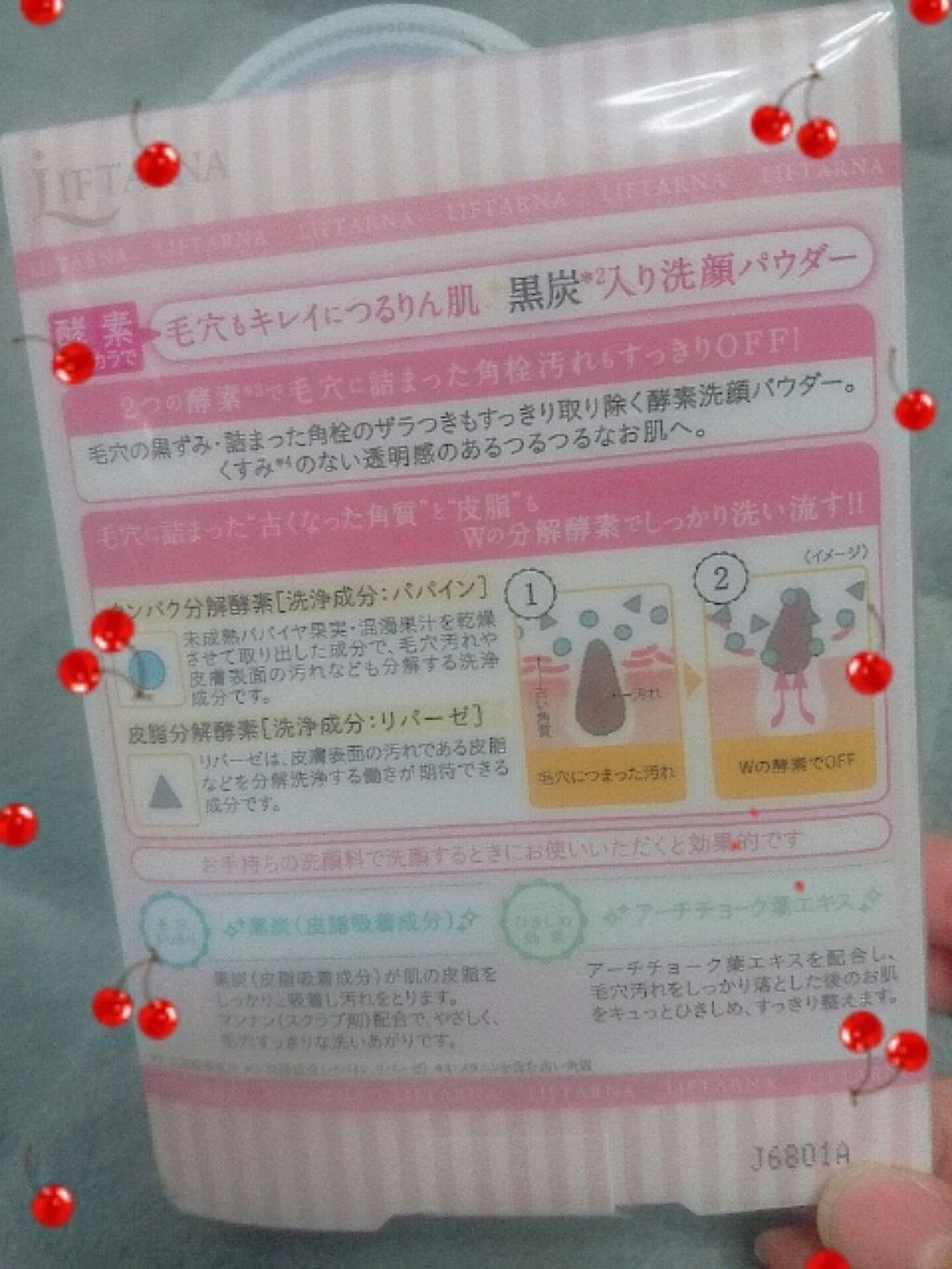 - 酵素*1の力で毛穴もキレイにつるりん肌!黒炭*2入り酵素洗顔パウダー 2つの酵素*1で毛穴に詰まった角栓汚れもすっきりOFF! 皮脂吸着成分の黒炭が余分な皮脂もしっかり吸着し汚れを落とし、透明感のあるつるつるお肌へ。 ●アーチチョーク葉エキス(ひきしめ成分) ●黒炭(皮脂吸着成分) ※1パパイン・リパーゼ(洗浄成分) ◆Wの分解酵素で毛穴に詰まった角栓汚れも スッキリ落とす ■タンパク分解酵素(洗浄成分:パパイン) 未成熟パパイヤ果実・混濁果汁を乾燥させて取り出した成分で、毛穴汚れや皮膚表面の汚れなども分解する成分です。 ■皮脂分解酵素(洗浄成分:リパーゼ) リパーゼは、皮膚表面の汚れである皮脂などを分解洗浄する働きが期待できる成分です。 ◆黒炭(皮脂吸着成分)で毛穴すっきり 黒炭(皮脂吸着成分)を配合した「黒い」洗顔パウダーが肌の余分な皮脂もしっかりと吸着し汚れをとります。 マンナン(スクラブ剤)配合で、やさしく、毛穴すっきりな洗いあがりです。 ◆濡れた手でもイライラせずに開けられる! 「ノンスリップカット加工フィルム」を採用 お風呂やクレンジングで濡れた手でもラクラク開封♪