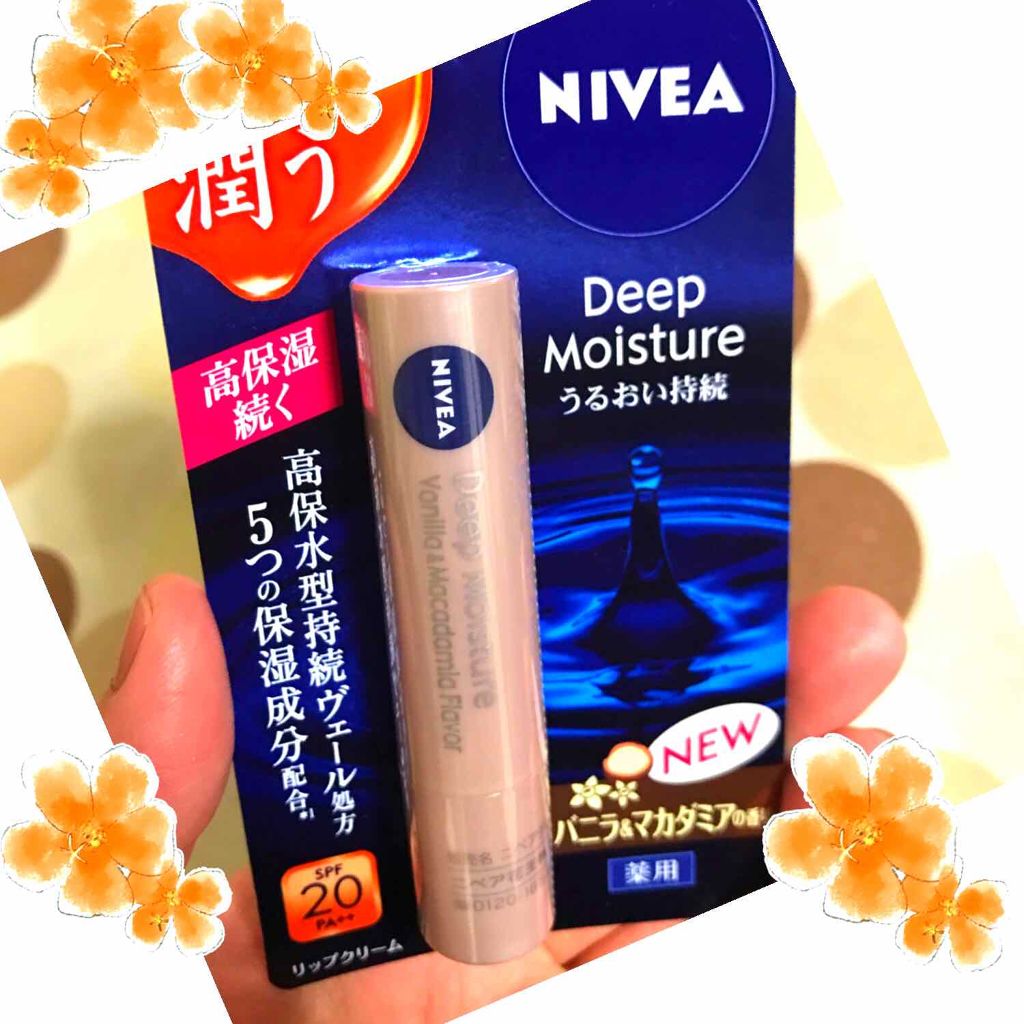 唇ふっくら、しっかり保湿力が続く♪ NIVEA DEEP Moisture SPF26 PA++ バニラ&マカデミアの香り 潤いの持続力があるから日中も唇の乾燥を気にせず過ごせるし、口紅のノリも良い感じ💄 保湿成分にはちみつ🍯やローヤルゼリーエキスが配合されてて、夜はリップパック代わりにもなる☺️