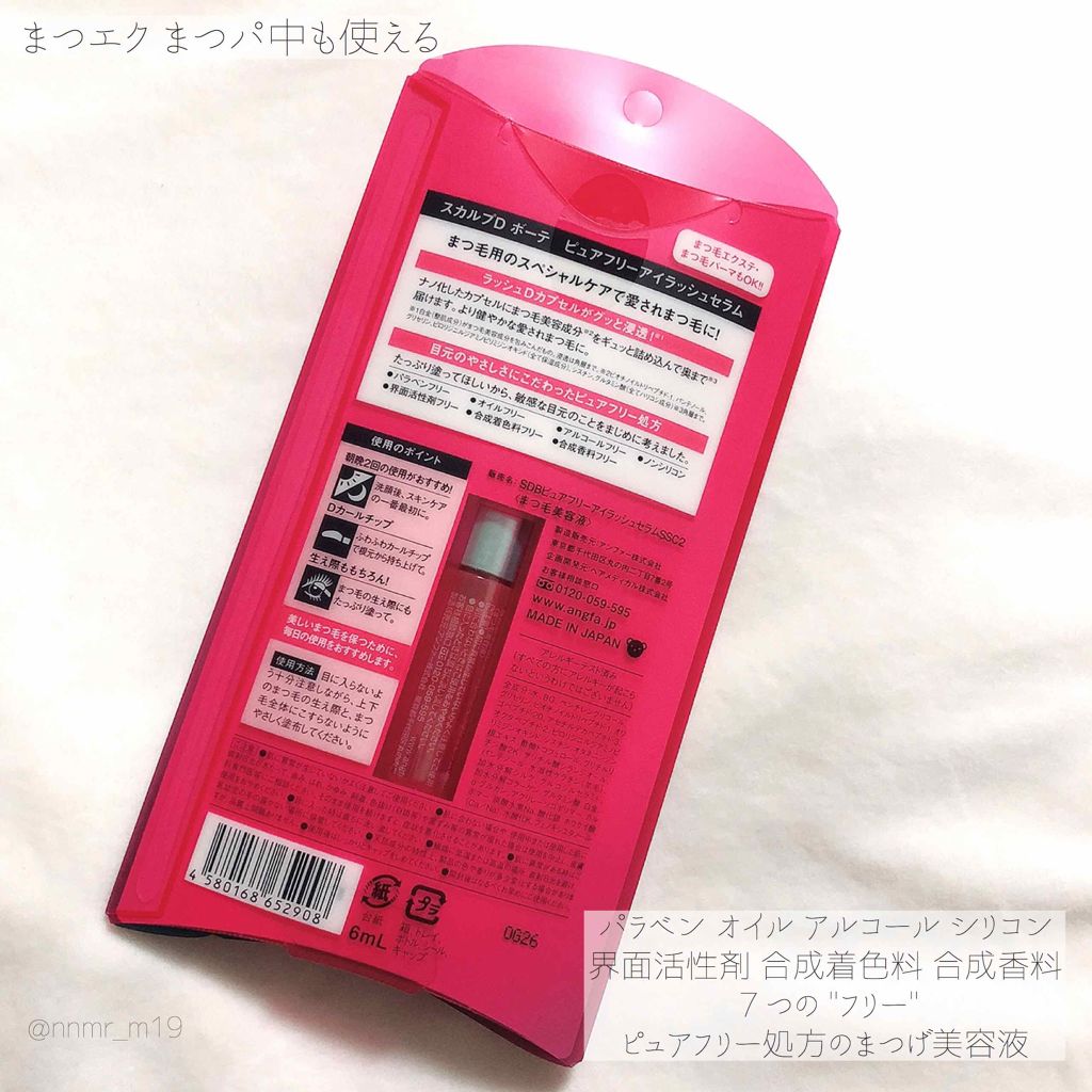 - スカルプDまつ毛美容液はまつ毛にハリコシを与えて、美しいまつ毛をしっかりキープ。 スカルプD独自開発のラッシュDカプセル配合で、角質層まで直接浸透。 より健やかな愛されまつ毛に導きます♪ 使いやすさ・やさしさにこだわった、ふわふわカールチップ採用で根元からも塗りやすく、敏感な目元にやさしい使い心地です。 シリコン、オイル、アルコール(エタノール)、防腐剤(パラベン)、香料、合成着色料、界面活性剤、プロスタグランジン類似物質の8つの成分不使用の“ピュアフリー設計”を実現。 まつ毛エクステ、まつ毛パーマにもご使用いただけます。
