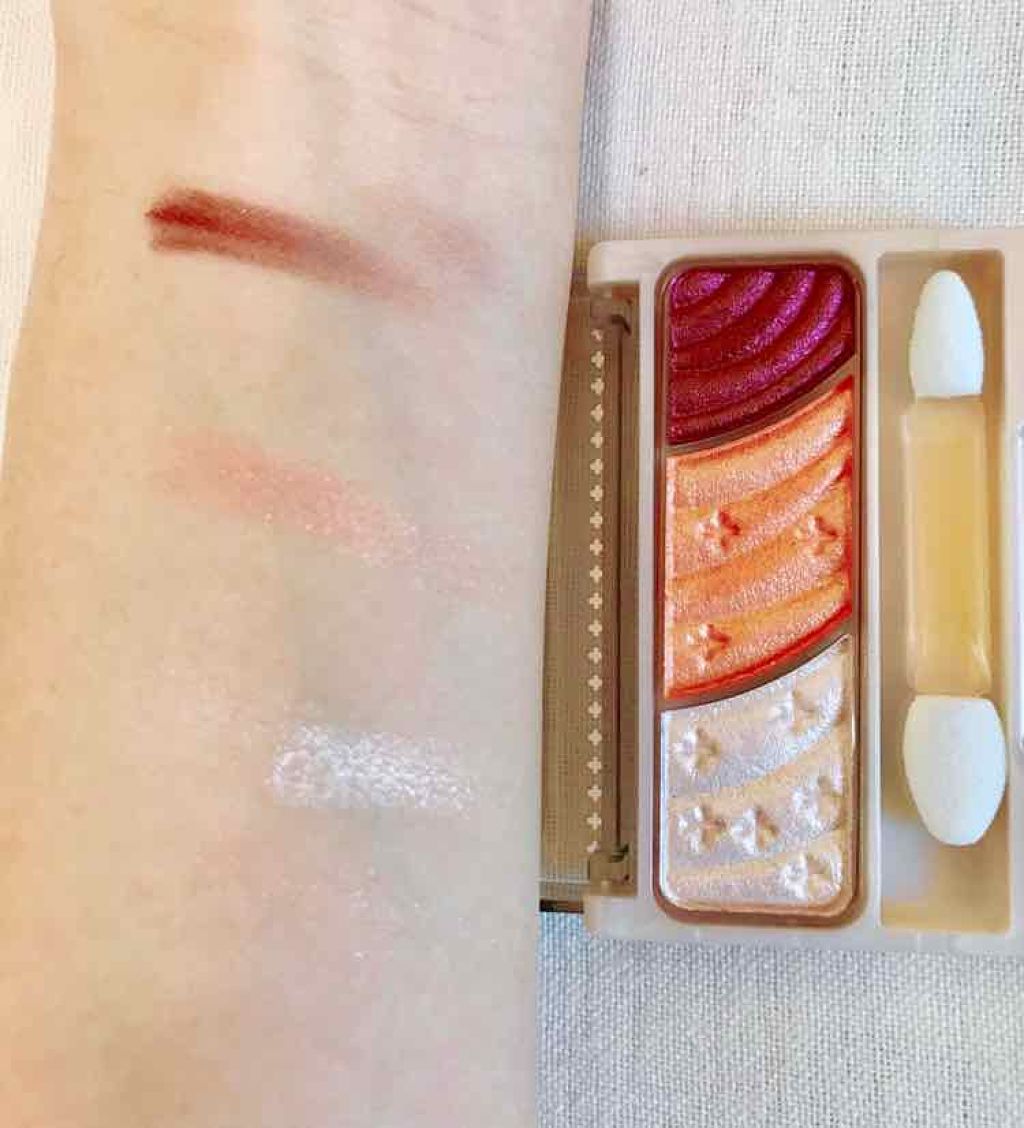 - 3色で簡単に明るく大きな目元に。 しっとり感触のアイシャドウ。 くすみを飛ばす明るさベース、ひとえ・奥二重の方でも幅広く塗れる肌なじみの良い中間色、 濃密高発色の締め色が目の輪郭を強調し大きな目元に。 微細パール配合でくすみを飛ばし、明るい目元へ。