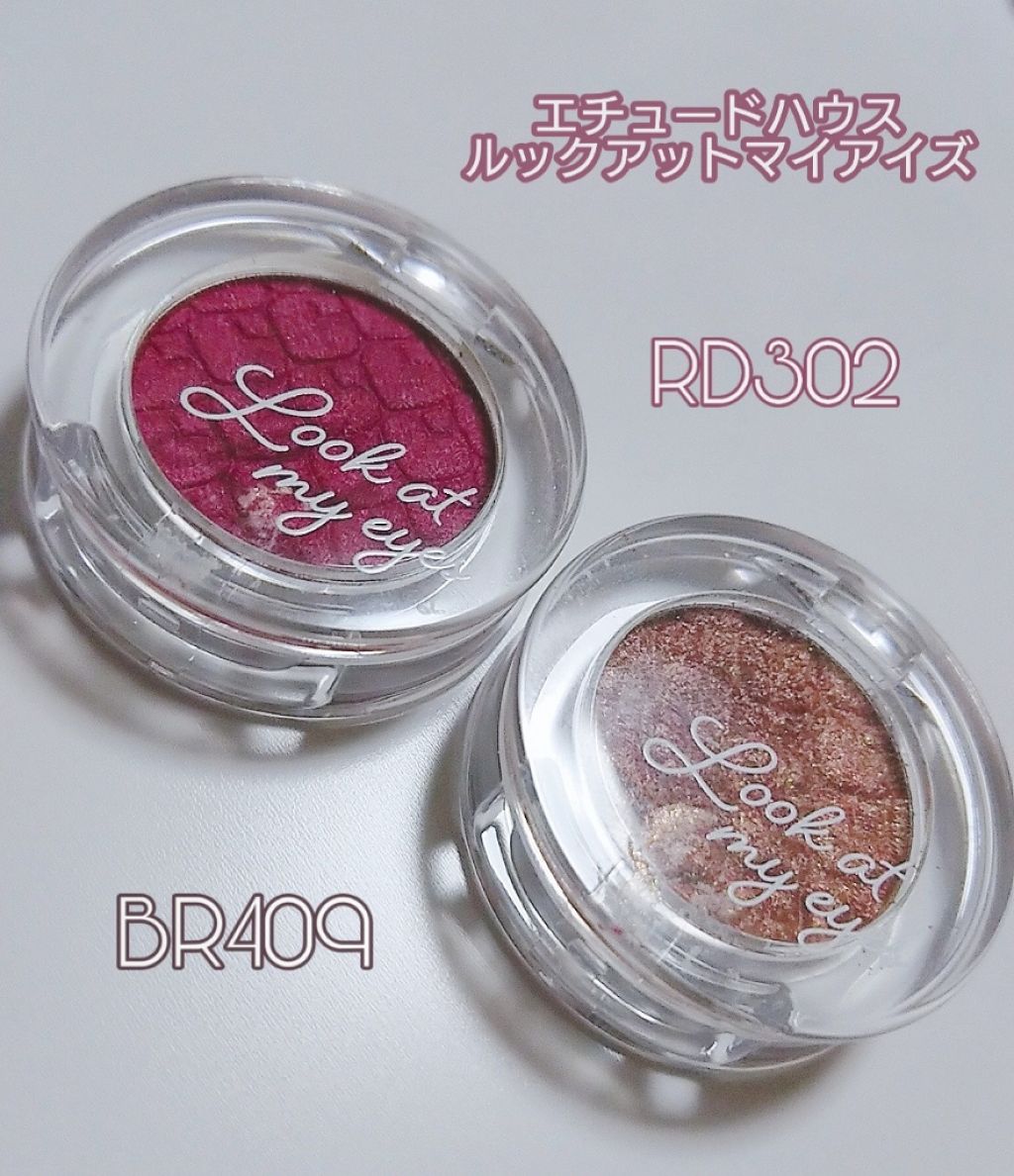 ①ルックアットマイアイズジュエルRD303②ルックアットマイアイズジュエルPK006③ルックアットマイアイズジュエルRD301④ルックアットマイアイズBR409ラメ感がきれいで、さっと塗るだけでも発色がいいです!①、③は涙袋にアクセントとして...