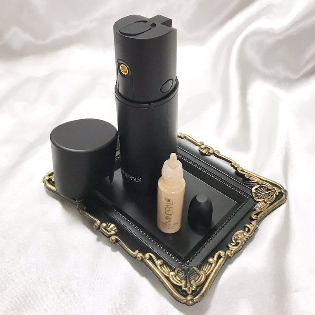 ベースメイクがたったの30秒で終わる 充電が終わったら、ファンデーションをよく振り、本体カバーを外し、キャップを開けてファンデーションを注入! お肌から6cmほど離し、くるくると円を描くように顔全体にスプレーします。 ファンデーションはとっても細かくて、エアブラシのようです! 気になる部分は顔から3cmほど離してミストすることで コンシーラー代わりになるんです! だいたい30秒くらいで全顔に塗布が終わりますので そのまま1分くらい放置し、ファンデーションを定着させます。 もともと艶感のあるベースメイクが大好きで 今まではクッションファンデを使っているたのですが、 「ヤーマン ミネラルエアー」はより一層艶が出ていい感じに仕上がりますね。 この粒子の細かさは、手塗りやブラシでは絶対出せませんから 「ヤーマン ミネラルエアー」ならではだと思います。