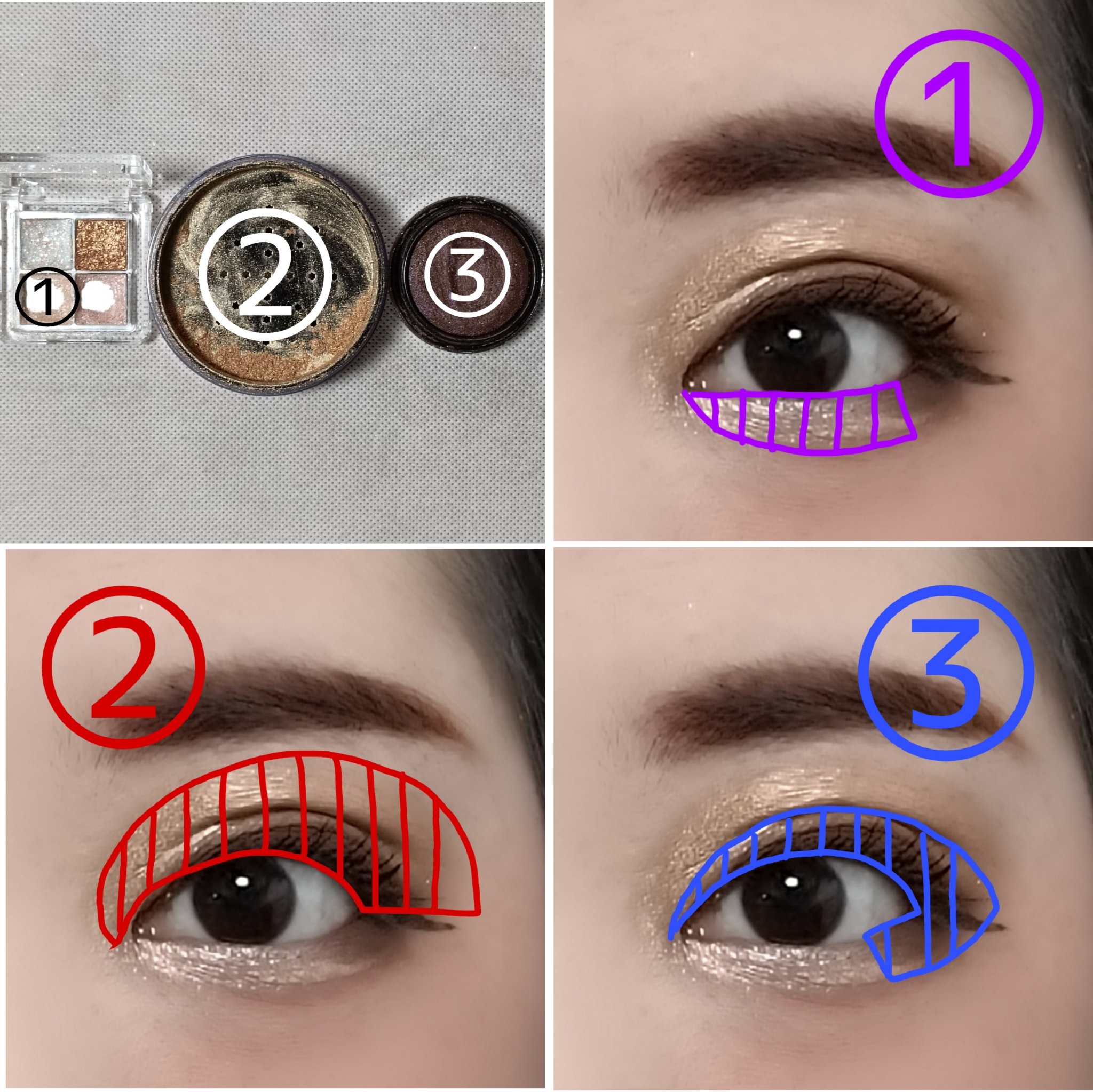 CEZANNE 皮脂テカリ防止下地 保湿タイプ 上下左右によく振ってから顔全体に塗り広げる。 BRIGITTE マルチBBクリーム 顔全体に塗り広げる。 ANNA SUI アイ グリッター 涙袋全体に塗布する。