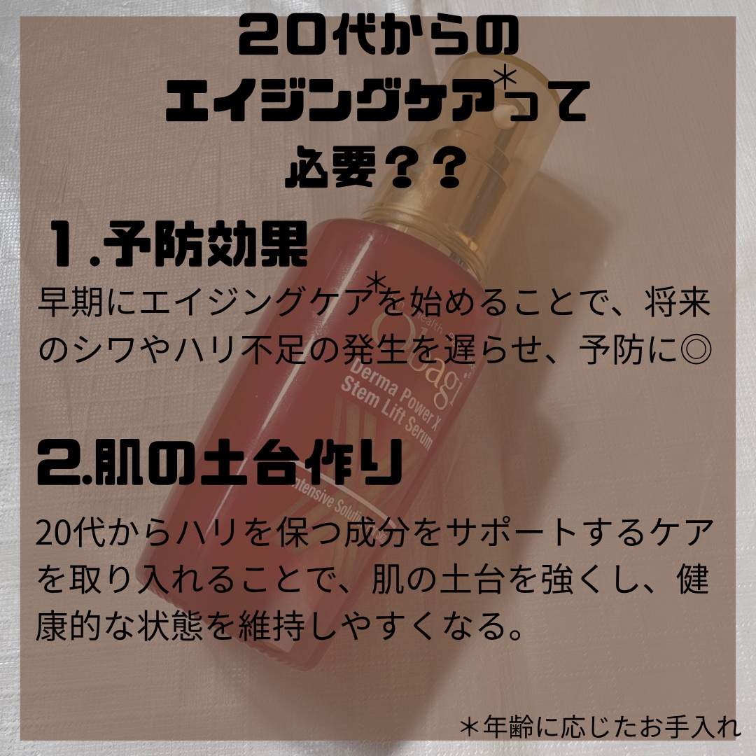 obagi ダーマパワーXステムリフト セラム30ml ¥5,500結論 📍"肌のハリにアプローチする美容液"_____________________☑️肌全体のハリ不足を感じる方☑️若々しい印象を保ちたい方☑️最初のエイジングケア※何を使ったらいいかわからない方にオススメの美容液です!さすがロート製薬さんと言わざるを得ない技術力です、、_____________________この美容液のすごいところは、ロート製薬、独自の浸透技術と、最先端の肌研究に基づいて選ばれた"ハリケア成分"が配合されているのもポイント!✮ディープターゲットデリバリーとは肌には、外から異物が入ってこないようにする「バリア機能」があります。でもそのバリアがあるせいで、美容液の“いい成分”もなかなか肌の奥※に届きにくいことがあるんです😢「ディープターゲットデリバリー」は、有効成分を必要なところにしっかり届けるための浸透技術。肌への負担をかけずに、角層のすみずみまで成分を届けてくれるんです!!すごすぎる...!※角層まで_____________________20代からのエイジングケア※のメリット「まだ若いから大丈夫」と思いがちな20代こそ、実は差がつくタイミング!今のうちに“育てるケア”をしておくことで、5年後・10年後の肌が変わるんです!!①予防効果肌の老化は、紫外線ダメージや乾燥、ストレスなどによって20代後半からすでに始まっています。早期にエイジングケア※を始めることで、将来のシワやハリ不足の発生を遅らせ、予防することができます!②肌の土台作りコラーゲンやエラスチンといった肌のハリを保つ成分は、加齢とともに減少します。20代からこれらの成分をサポートするケアを取り入れることで、肌の土台を強くし、健康的な状態を維持することが◎_____________________この1本で、土台ケア・ハリ感サポート・浸透技術のすべてが詰まってる美容液。✔ハリ不足が気になってきた✔若いうちから土台を整えたい✔高級感のある美容液を取り入れたいという人に、心からおすすめです!※年齢に応じたお手入れ最後までお読みいただきありがとうございました!#エイジングケア#obaji#エイジングケア美容液 #美容液 #ハリ美容液