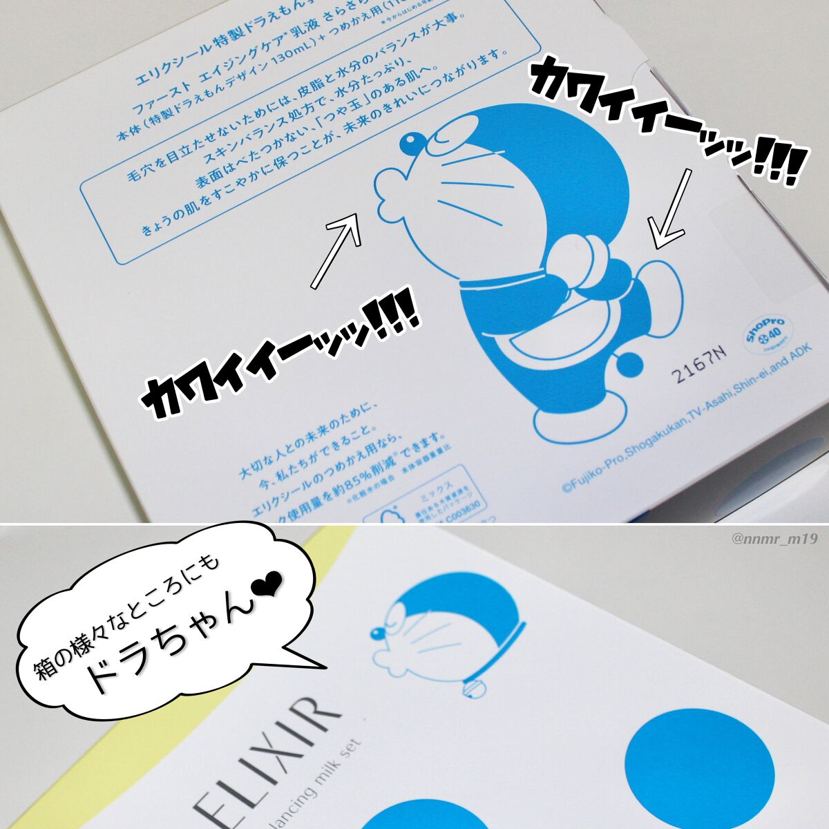 --------------------------------------#エリクシール#バランシングミルクセットIBR¥5,555--------------------------------------ELIXIR×ドラえもん限定コラボ!・白いドラえもんファーストエイジングケアライン【エリクシールルフレ】・ピンクのドラえもん美白&エイジングケアライン【エリクシールホワイト】2シリーズ、それぞれつめかえ付き化粧水・乳液セットがあり、ボトルデザインが異なります。こちらはファーストエイジングケアの乳液セット。どれも可愛くて発売前から熟考...。エリクシールのスキンケア製品のどのシリーズでも肌トラブルが起きたことはないので、今ストックがない乳液でボトルカラーが好みのものを選びました!カワイイ可愛いかわいい..."かわいい"しか出てこないくらいとにかく可愛いです。箱の色んなところにいるドラちゃんの表情、愛おしい。印刷されただけのコラボパッケージじゃなくて、容器の形そのものがオリジナルデザインって珍しいですよね!詰め替えを利用することで長く使い続けられるからとても嬉しい仕様です。しかもドラちゃん仕様はポンプ式で、通常品のフタを回してトントン出すよりも使いやすい!さらさらタイプの乳液は、きちんと潤うのに伸ばした後すぐでも肌がベッタリ重たく感じるような不快感がなくて心地よい!とろみのある化粧水、ない化粧水どちらとも自然に馴染んでくれるので他アイテムとの相性もさほど気にしなくて大丈夫そう。フレッシュブーケの香りは新鮮なお花や石けんのような雰囲気も感じるような気がします。ほのかに香る程度なので、強い香りが苦手な方のネックになることもなさそうです。限定ボトル初回使用時にあれ?いくら押しても出ない...と心配になりましたが、かなりの回数空押ししたら出てきました!エリクシールは近くのドラッグストアでも購入できるからポイントサービスのあるお店ならお得に買えたり、一点から送料無料で発送してくれる資生堂公式通販サイトワタシプラスは取り扱い商品が多くまとめ買いにピッタリ。継続商品が資生堂のものなら特にオススメです。おまけがついてきたり、ポイント10倍やブランドごとのキャンペーン実施にクーポン発行、決済方法も種類が多く、発送もかなり早いので頻繁に利用しています。今回の限定品も近隣の店舗でどこにも入荷していなかったので、ワタシプラスで購入しました!これまで愛用してきた方、少し離れていた方、エリクシールが気になっていたドラえもん好きの方にもオススメしたい可愛いコラボ商品。特徴と選び方を簡単に説明!年齢に応じたお手入れをし始めたいならファーストエイジングケアの【エリクシールルフレ】毛穴が気になり始めたらはじめどき、とのことです。基本の保湿で透明感、毛穴の目立ちにも対応! みずクリームやおしろいミルクもこのシリーズ。ハリも透明感もある肌を目指す本格的なエイジングケアには美白&エイジングシリーズの【エリクシールホワイト】価格がファーストエイジングシリーズより高価ですが、美白有効成分が入っていてシミそばかす予防にも期待ができます。 朝用乳液デーケアレボリューションはこのシリーズ。共通して期待できるのは潤いがたっぷりのつや玉お肌。エリクシールのいくつかの商品を試してきましたが、皮脂と水分のバランスを整える効果が優れています。テクスチャが複数用意されていたり、使いやすさも◎テカリとは違う"つや玉"があるいきいきした肌は素肌にも自信がつく!ドラえもんと一緒に毎日のスキンケアを楽しみながら続けていきたいです!