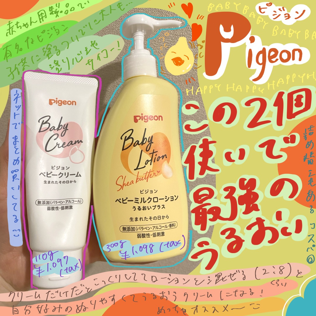 ピジョンベビーミルクローションうるおいプラス300gアカチャンホンポにて購入。子どもが3ヶ月頃から愛用😌1つ前に使っていたローションに比べて保湿力が今ひとつな使用感でしたが、かなりサラサラしているからかも?伸びは良く少量でも広範囲に塗り広げる事ができます。容器が白いタイプの種類もあるので、今度はそっちを使ってみようかな!1本はだいたい2ヶ月位で消費し、詰め替えを購入しリピートしました(*^^*)冬はもう少し保湿力の持続するものに帰るか悩み中です!