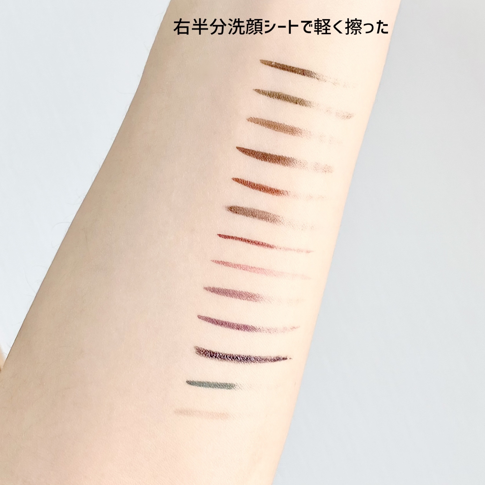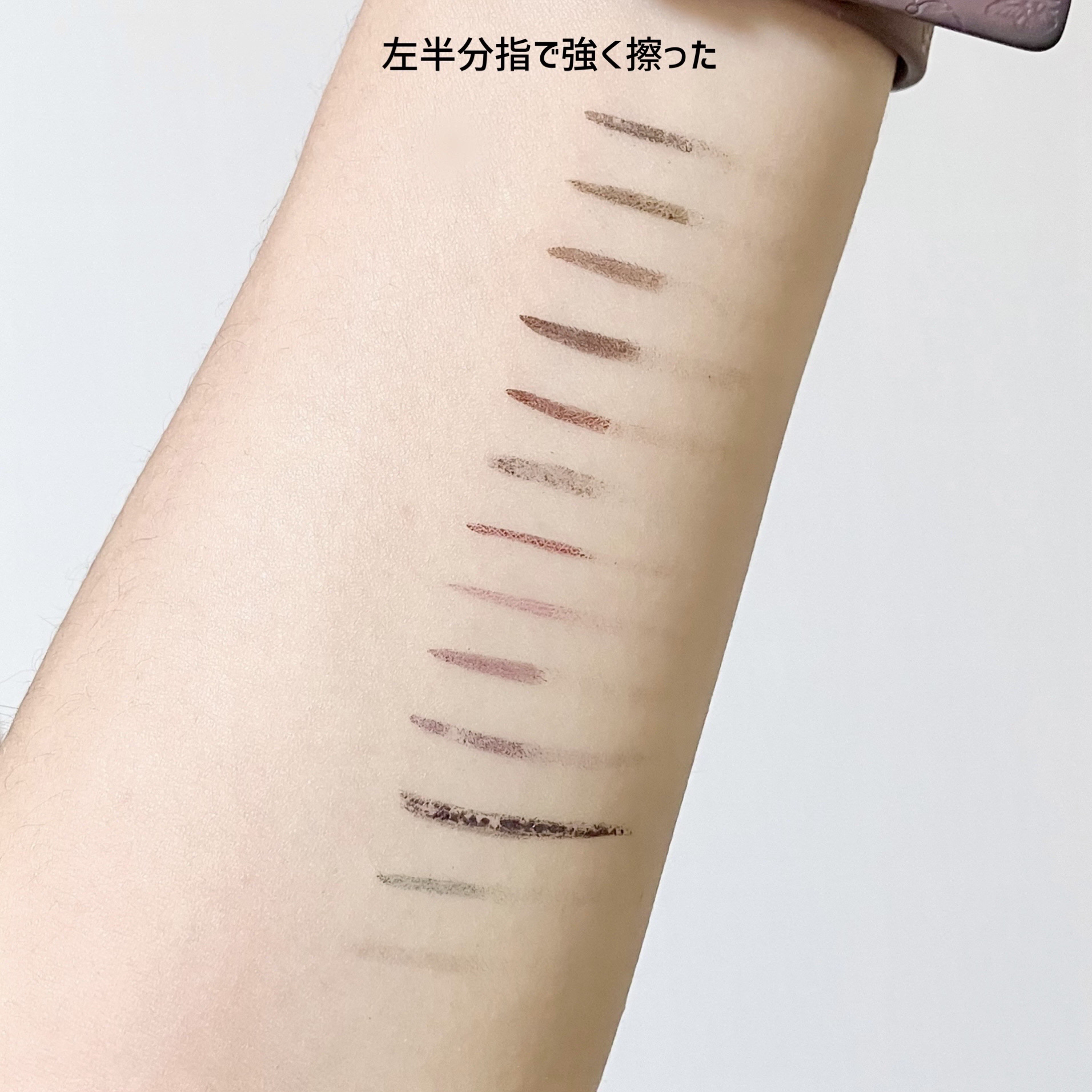 アイライナー10種13カラー比較!整理を兼ねて全部出したので、ちょっと古いものも含まれます🙇♀️油分耐性をチェックするためハンドクリームをつけた手で擦ったところマジョマジョが1番耐性あり。次にUZU、ルミアグラスと続きます。洗顔シートで拭いたところはほとんどさらっと落ちました。残りの左半分は、何もつけない指で強く擦って摩擦耐性チェック。ルミアグラス、UZU、D-UPの3種が同じくらいですかね。総合的に優秀なのはルミアグラス。描きやすくて色もたくさんあるので他の色も使ってみたいです。ちなみに私の愛用遍歴はデジャヴュのブラウン→BBIAチョコブラウン→ルミアグラスサンドブラウンという感じです。目が強くなりすぎない明るめカラーが好き。UZUはなかなか優秀ですがおそらく2023年のリニューアル前のもの。新しいものも気になりますね。マジョマジョのラメ入りは大好きなんですがノック式がかなり面倒で付かなかったりドバッと出たりでした。zeeseaは珍しい色味で好きでしたが、銀のパケがボロボロになって悲しい。以下使用したものリストLUMIURGLASスキルレスライナー02.ローストブラウン05.サンドブラウン06.ルージュバーガンディD-UPシルキーリキッドアイライナーWPアプリコットブラウンピンクショコラMAJOLICAMAJORCAジェルリキッドライナーBR660何億光年GY802べたぼめUZUBYFLOWFUSHIEYEOPENINGLINERカーキフローフシモテライナーチェリーチークZEESEAカラーリキッドアイライナーグレープパープルMAYBELLINENEWYORKハイパーシャープライナーRKH-1カーキDintoワンバイワンアイディファイナー412インザライトBBIAラストペンアイライナー03チョコブラウン#アイメイク#アイライナー#アイライナーリキッド#リキッドアイライナー#ブラウン#ルミアグラス#カラーメイク#カラーライナー#持ってるやつ全部出す#冬顔メイクテクニック