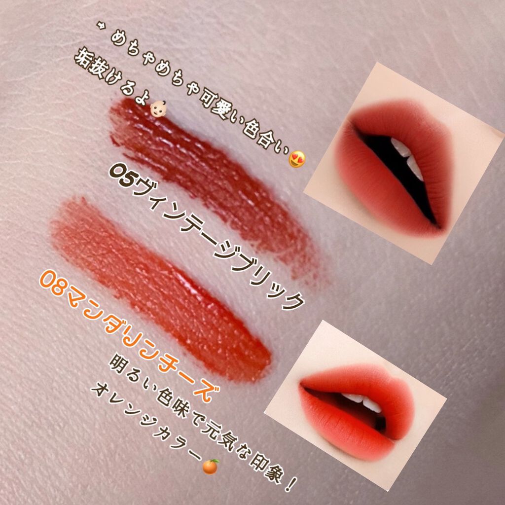 Eglipsさんからベルベットフィットティントとブラーパウダーパクトを購入させて頂きました^_^❤︎・#vintageorange#03#vintagebrick#05少し固めのムースのようなクリーミーなテクスチャーで仕上がりはベル...
