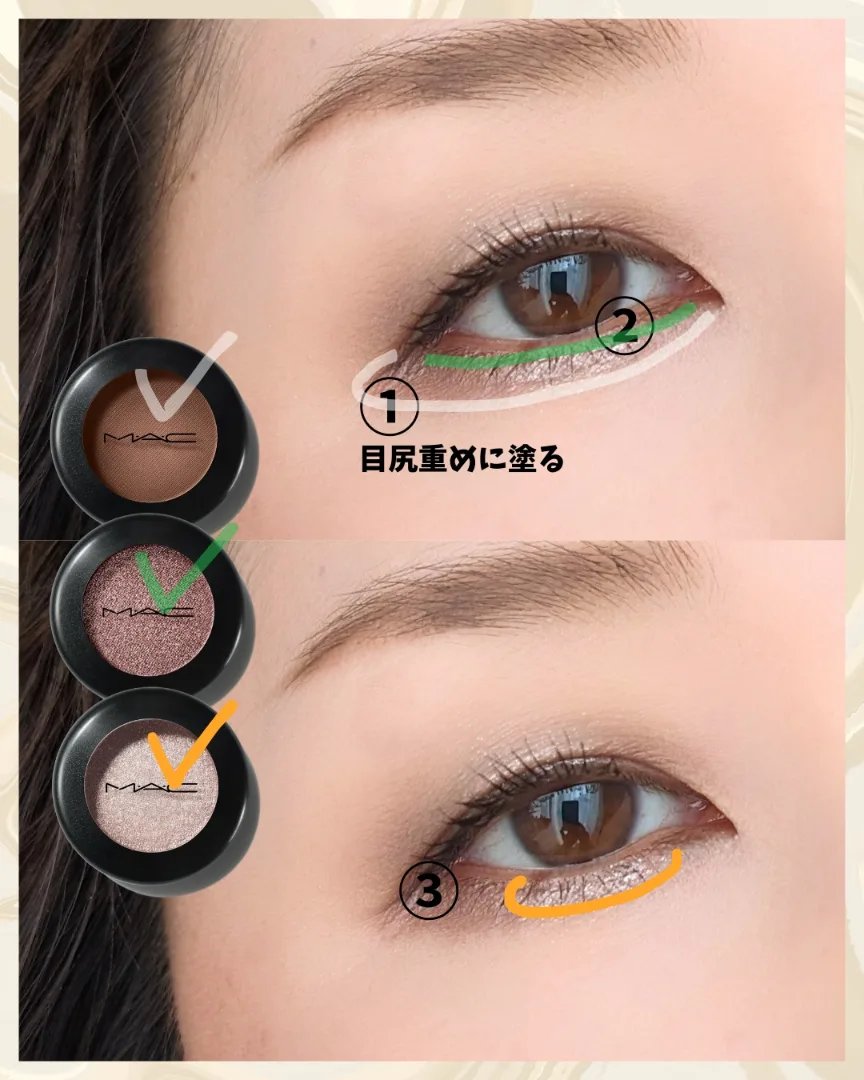 【MACおすすめアイシャドウカラー】①スモールアイシャドウ オメガ②エクストラディメンションアイシャドウ レジェンダリールアー③ダズルシャドウ シースパークルズ①のオメガをまぶた全体に②を目のきわから内へ③を目頭から内側へこんな感じで適当にグ...