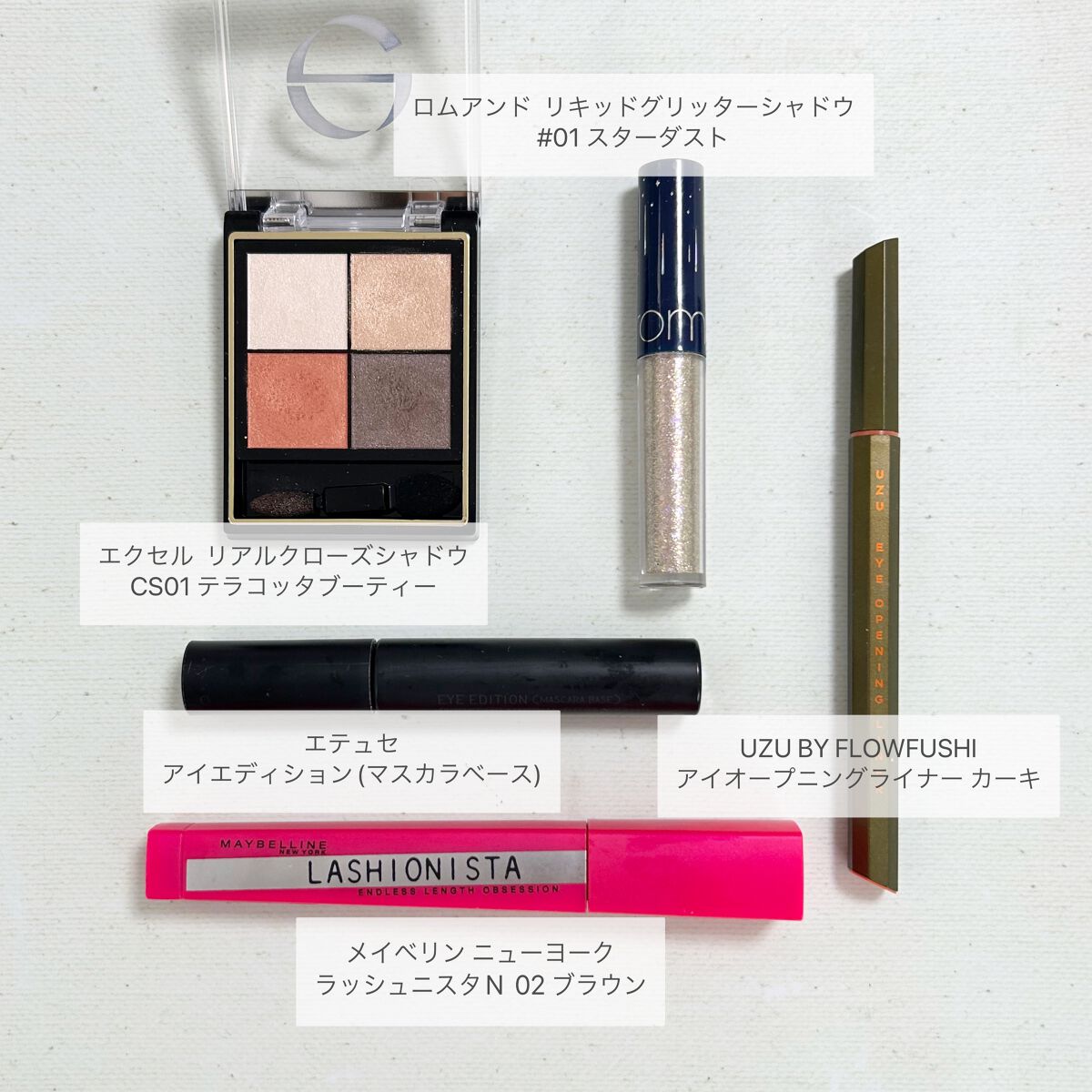 〈化粧下地〉#エリクシールバランシングおしろいミルクC 〈ファンデーション〉#TIRTIRマスク フィット レッド クッション 〈コンシーラー〉#Diorディオールスキン フォーエヴァー スキン コレクト コンシーラー 〈フェイスパウダー〉#コスメデコルテフェイスパウダー 〈ハイライト〉#セザンヌパールグロウハイライト 〈シェーディング〉#マジョリカマジョルカフォルムリメイカー 〈チーク〉#SUQQUピュア カラー ブラッシュ 〈アイシャドウ〉#excelリアルクローズシャドウ#ロムアンドリキッド グリッター シャドウ 〈アイライナー〉#UZU BY FLOWFUSHIアイオープニングライナー 〈ノーズシャドウ・アイブロウパウダー〉#CEZANNEノーズ&アイブロウパウダー 〈アイブロウマスカラ〉#ヘビーローテーションカラーリングアイブロウマイクロ 〈リップ〉#リュバンブランエターナルリップグロス#M・A・Cリップスティック