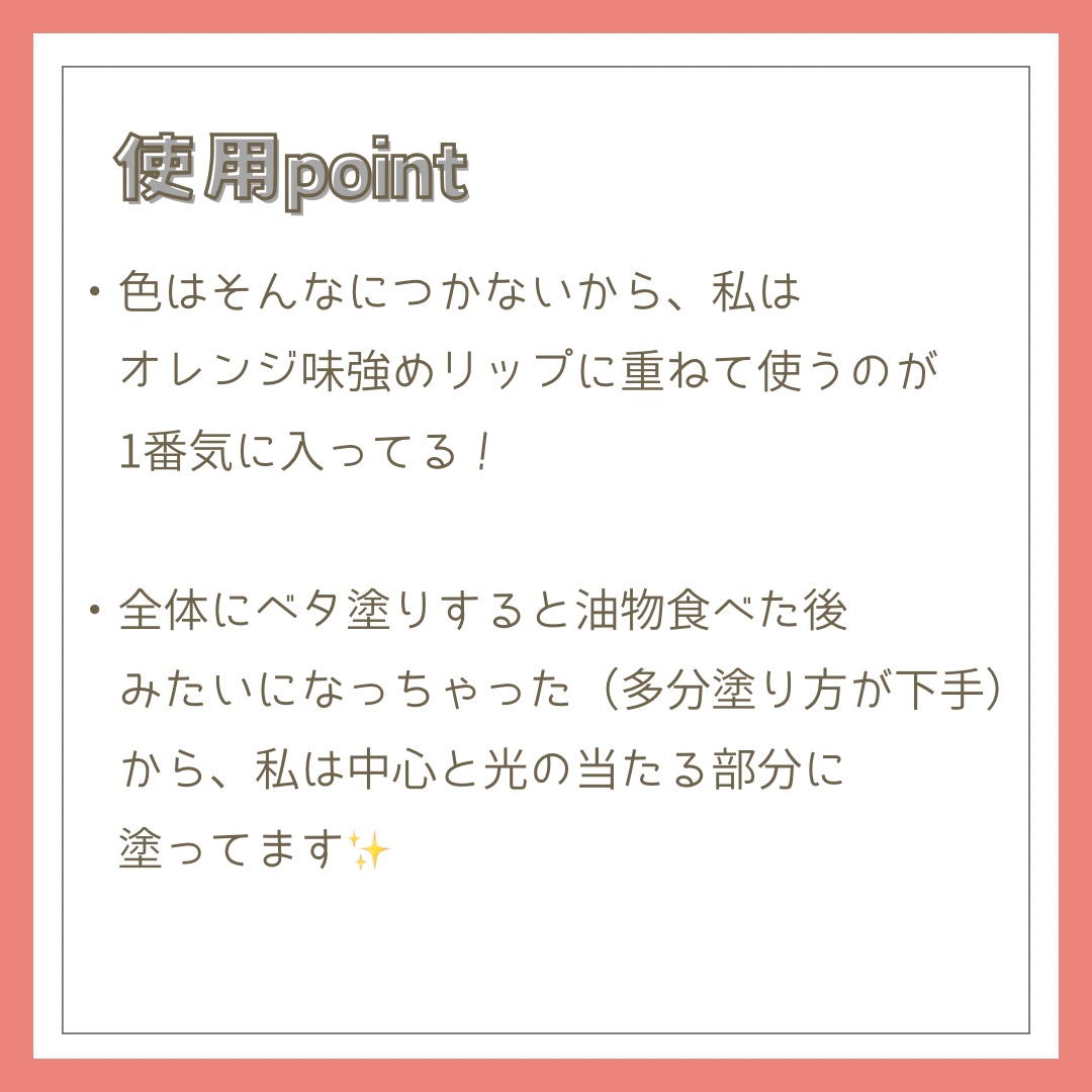 色味的にはあんまりイエベ向きじゃないのかな…??とか思ってたけど、ほんのり色づくくらいだからすごく使いやすい! 上品なツヤリップ作りに欠かせないです❣️ 色味は好きなんだけど、マットなんだよなぁ…っていうリップに使うことが多いです✨