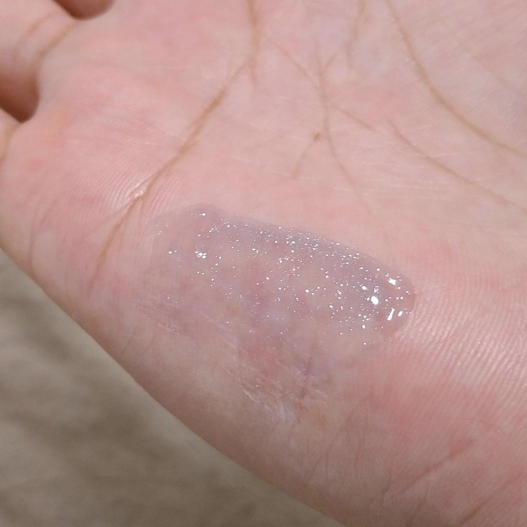 無香料なので使いやすいと思いました。いつものリップの雰囲気を変えたいというときにおすすめです。 青やシルバーのラメがキラキラして綺麗。ベースは透け感がありつつも程よい深さの青色なので唇に塗ってみると少し落ち着いた色味になります。 スパチュラはシリコン製で唇にフィットしやすい斜めの形。スパチュラタイプなので衛生的に使えていいです。