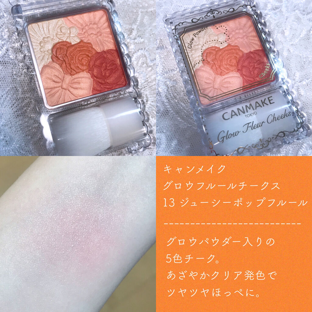 #13ブライトオレンジこのチークは男性受けが良いみたいです。これを付けた時に「綺麗になったね。」と、複数の人に言われました。粉質も、発色も良く、ふんわりした質感で、パケが薄いのでポーチの中でもかさばらない。お気に入りです。