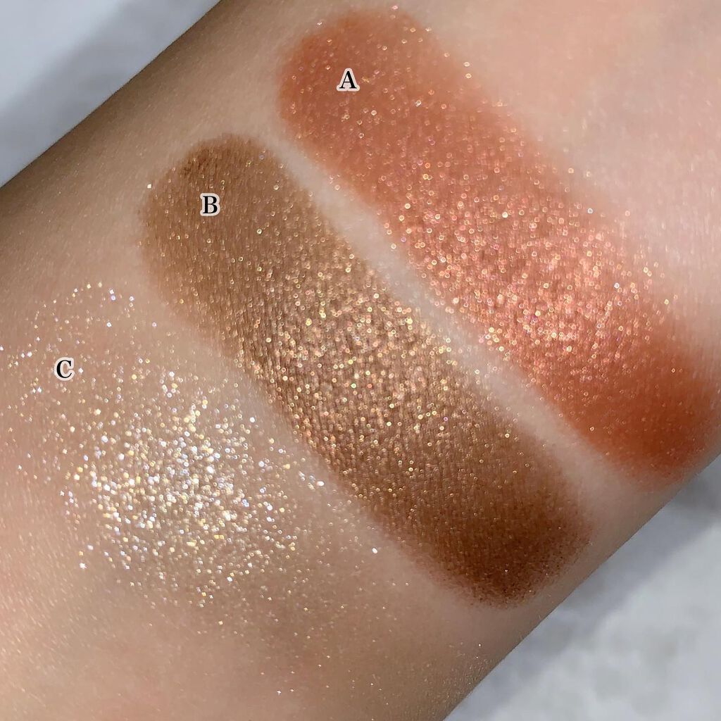 以前投稿したブラックサンドが気に入って早くも追ってしまいました😇上段はシルバー&ゴールドラメのパウダー、下段はブロンズカラーのクリームアイシャドウ。スウォッチは上からパウダー、クリーム、重ねたやつです✨スウォッチの動画みてもらえれば伝わると思...