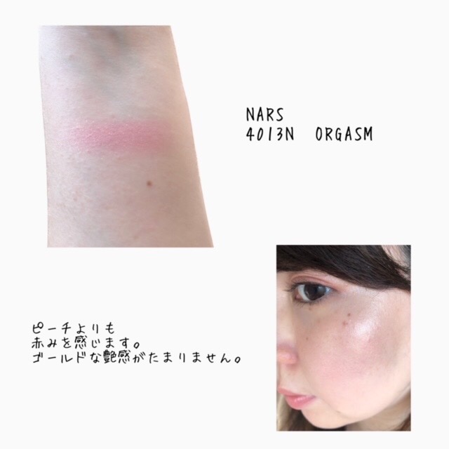 NARSブラッシュ4013NORGASM「みたらわかる、すごいやつやん」以上です。とにかくゴールドラメ。ラメが小さくてラメラメというより、ツヤがすごい。ゴールドの天の川。ゴールドのツヤが綺麗すぎるピーチピンク。あれ?どうする?ちょっといい女く...