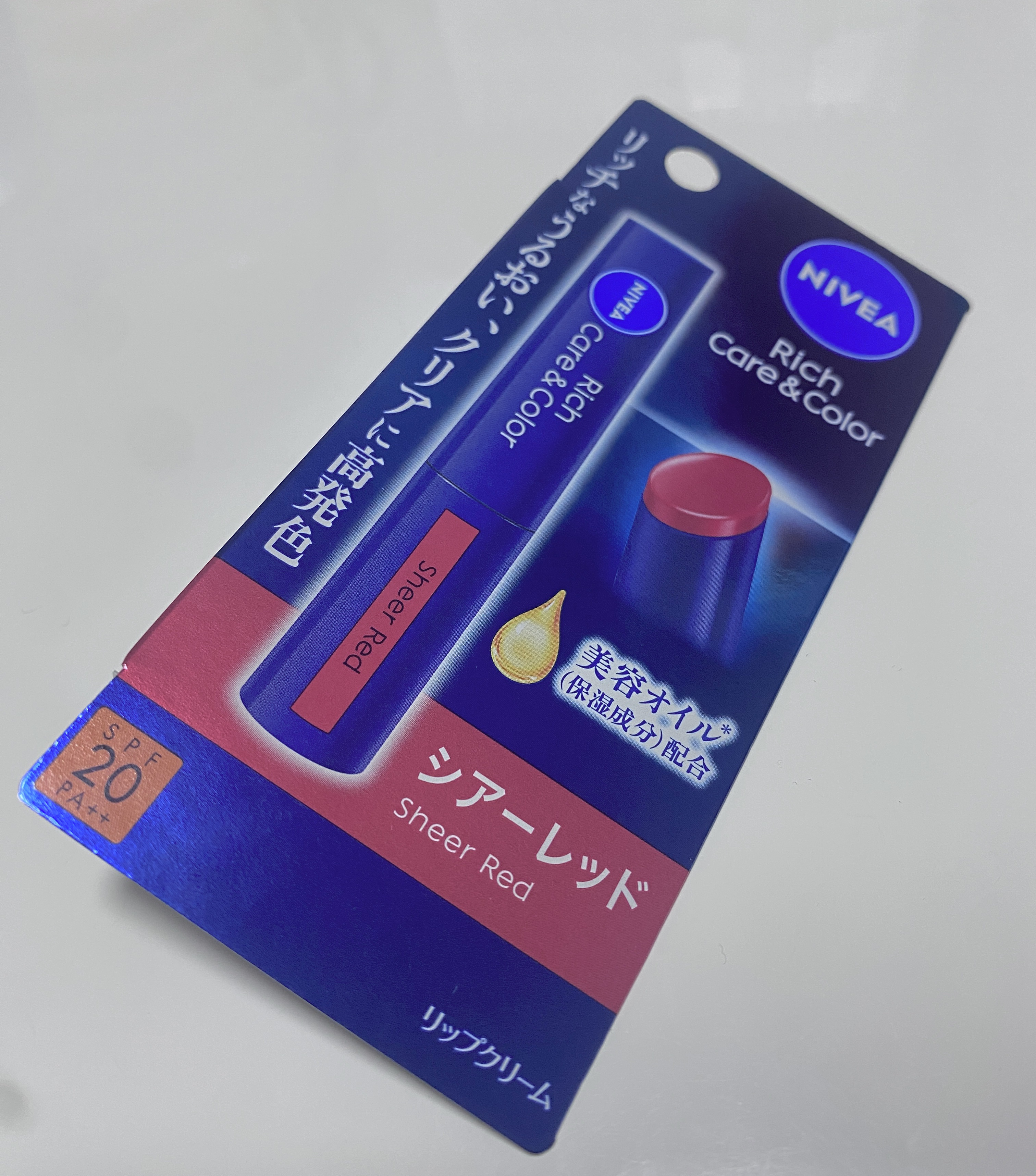ケアしながら色・艶・ふっくらが叶う色付きリップクリーム。シアーレッドという色名通り、透明感のある赤色なんだけど、重ねると結構色づくし艶もあります。ニベアのリップクリームの中だと、もっと色づくリップもあるようですが、仕上がりは普通にキレイなので、こちらでも私は充分だと思います😊リップ製品にはまだ少し珍しいUVカット成分も入っていて、SPF20,PA++あります。紫外線効果を保つためにはこまめに塗り直さないといけないみたいだけど、ティッシュで普通に取れるから、色持ちをキープするためにもいいと思う。リップグロスが好きなので、正直ちょっと、所詮色付きリップクリームでしょ?って思ってたんだけど、使い心地、発色あらゆる点で良くてびっくり(・・;)色も沢山あるみたいなので、他の色にも興味が湧きました!あと箱がなんか高級感ある感じなのも良かったです♡