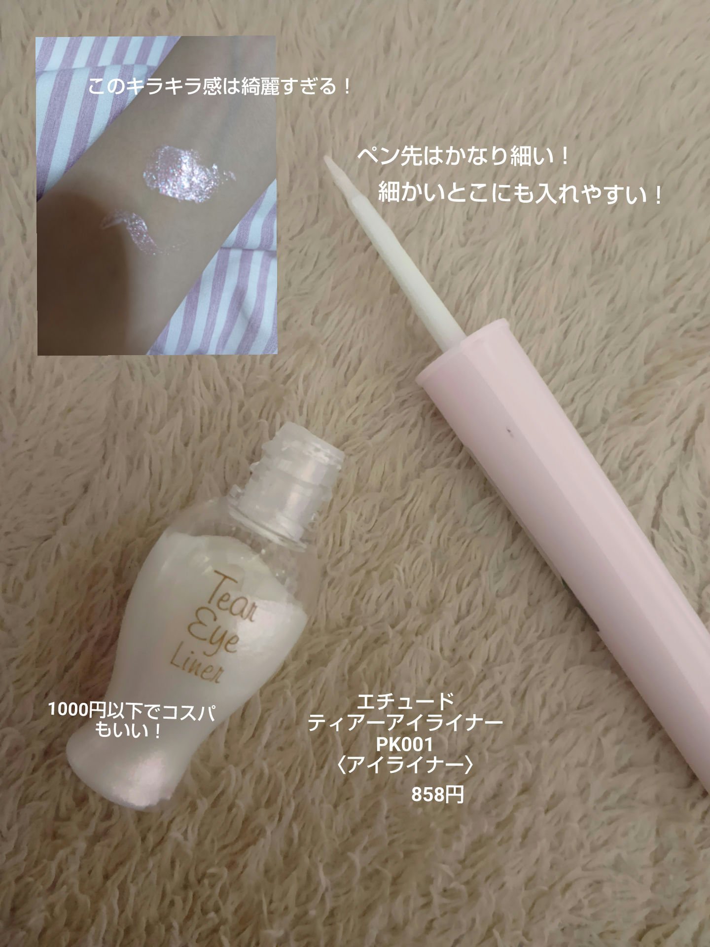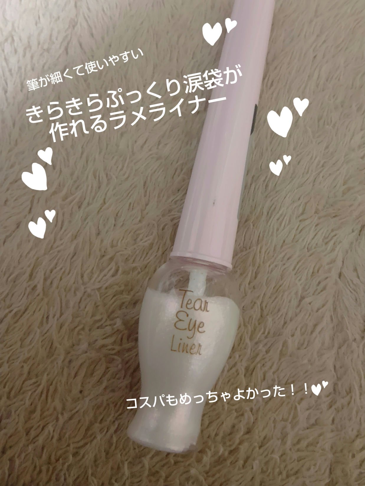 実際使ってみると、リキッドなので仕方ないのですが かなり、みずみずしい😢 涙袋にガッツリ塗ると、ヨレてすぐとれます。 密着感もありません...。 筆も細すぎて塗りにくかったです。 指でぽんぽん伸ばしてみても、すぐ消える。 涙袋って上手いこと伸ばせないですよね...。 そこで、私は目頭に少量だけつけて使用してます! そうすると控えめだけど、キラキラしてて可愛い♡ コスパは良いけど、期待してたのとは違ったので リピートはなしです😢(ごめんなさい)