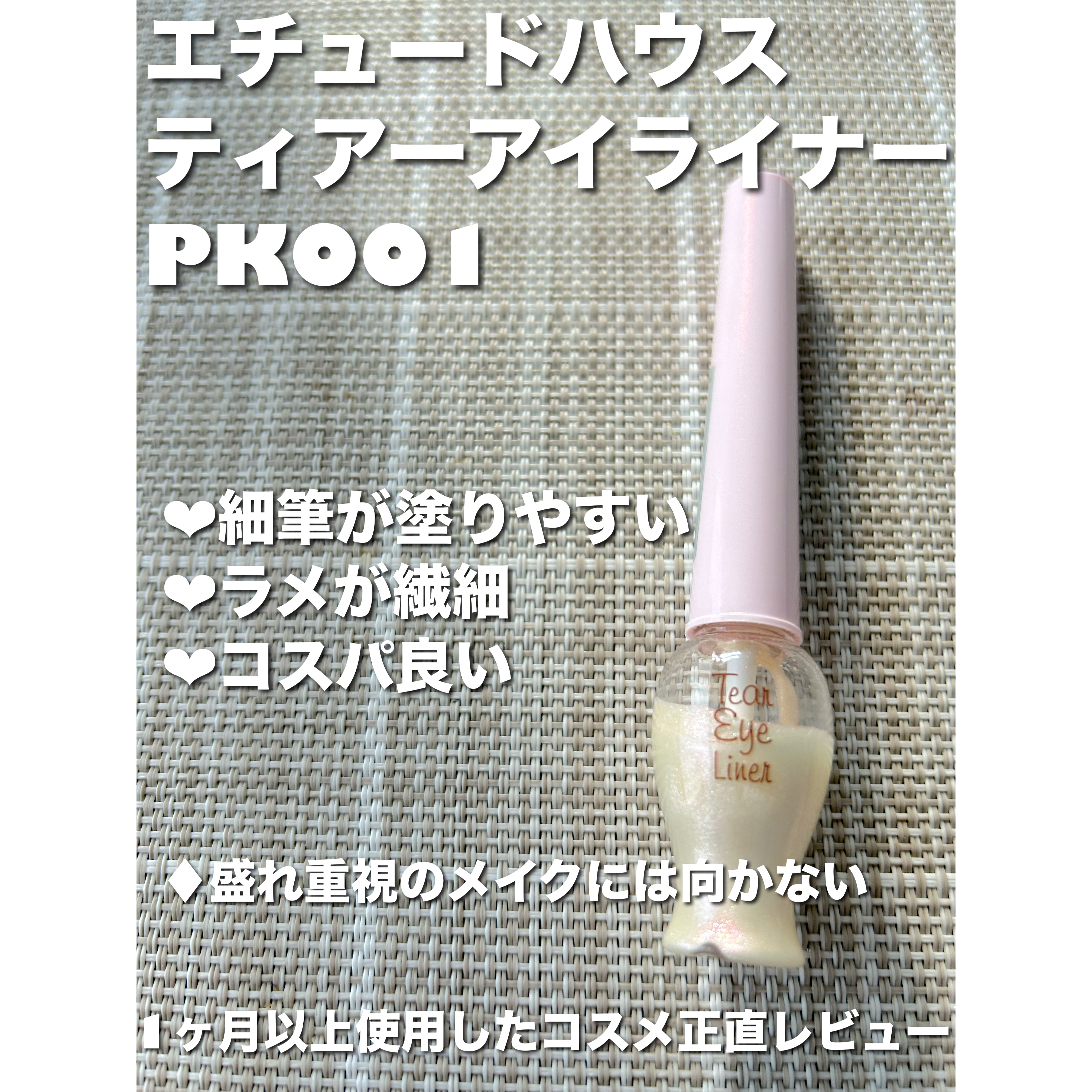 【ETUDEティアーアイライナーpk001】元祖涙袋ライナーと言えば私の中ではこれ!PK001番はホワイトベースの液にピンクや青、ゴールドのラメがたっぷり入ったカラー。色白さんにおすすめのカラーです。私は目の下真ん中ぐらいに乗せて指でポンポン...
