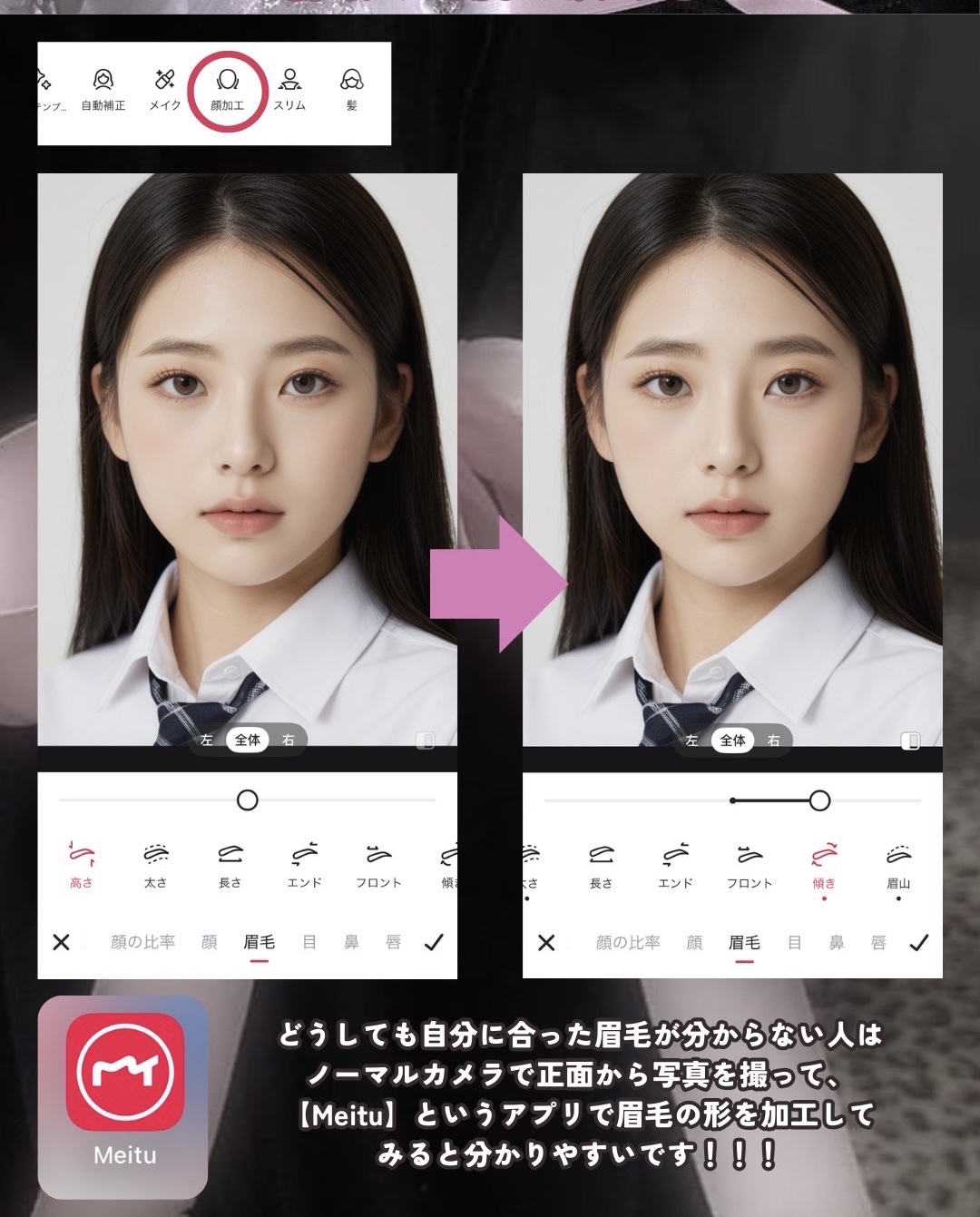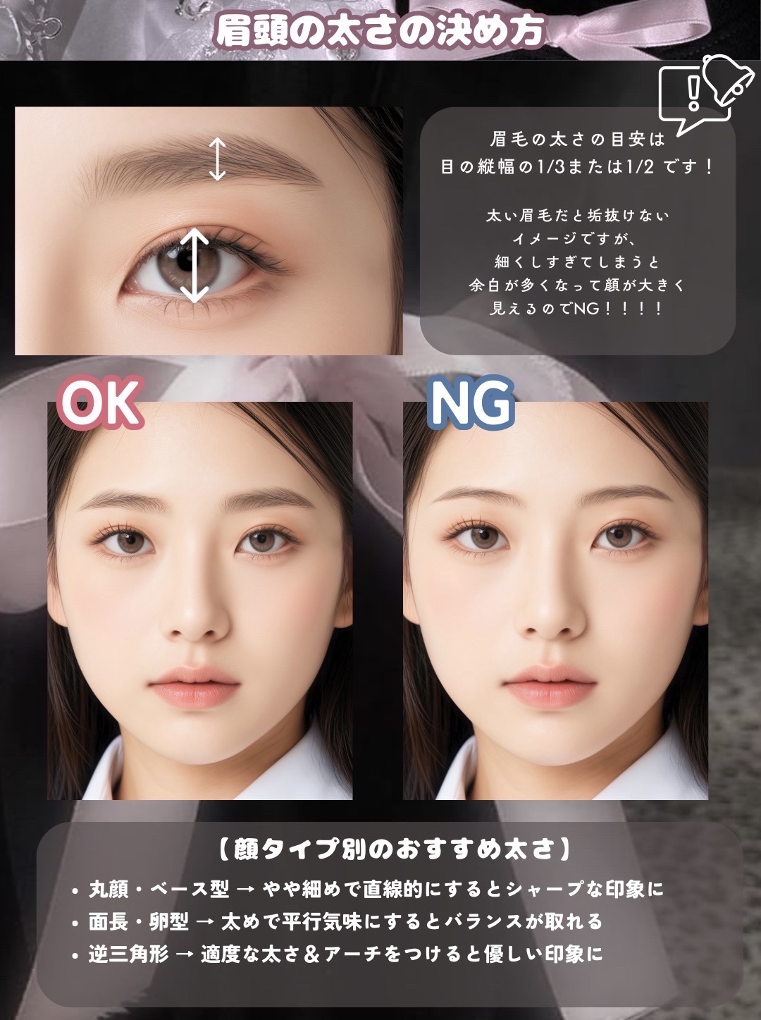 似合うのはどの眉毛?𝜗𝜚自分に似合う眉毛の見つけ方ᝰ✍🏻୨୧┈┈┈┈┈┈┈┈┈┈┈┈୨୧今日【垢抜け眉毛の教科書】という眉毛の整え方が分かる投稿をしたので合わせて見て欲しい、自分に合った眉毛のみ付け方です!!✨️【1】顔の形別・似合う眉の形●丸顔→アーチ眉orなだらかな平行眉👉🏻縦のラインを強調してシャープに見せるのがポイント●面長→太めの平行眉👉🏻縦の長さをカバーしてバランスの取れた印象に。●ベース型(エラ張り)→やや角度のある眉👉🏻顔の骨格に沿ってスッキリ見せながら、優しい印象も演出。●逆三角形(あごがシャープ)→アーチ眉or丸みのある眉👉🏻シャープさを和らげて、フェミニンさアップ。●卵型→基本的にどんな眉でも似合いやすい👉🏻自分の好きな雰囲気に合わせて眉の形を選んでOK。【2】目元や骨格に合わせた調整も大切!・目力が強い→柔らかいラインの眉でバランスをとる・顔が平坦な印象→少し立体感のある眉で引き締め効果を【3】なりたい印象から選ぶ眉デザイン・ナチュラル・優しげ→平行眉、ふんわりストレート眉・大人っぽい・クール→角度のあるアーチ眉・可愛らしい・若々しい→丸みのある優しい眉・垢抜け・トレンド感重視→平行×太め×毛流れを活かしたナチュラル眉【4】自分の眉毛の素材もチェック!・毛量が多い→形はシンプルに、抜け感を意識・毛が細いor少ない→パウダーやペンシルでふんわり補う・毛流れが乱れやすい→スクリューブラシで整えてから眉マスカラでキープぜひ合わせて⤵︎⤵︎の投稿も見てみて下さい!!!!